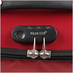 Чемодан от компании "Polar" на двух колёсах выполнен из прочного материала (нейлона и полиэстера). Чемодан закрывается на молнию, присутствует также встроенный кодовый замок.Внутри есть одно большое отделение , в котором присутствуют ремни для фиксации вещей, отделение для ноутбука и маленький карман на молнии для документов. Снаружи расположен объёмный карман на молнии для мелких вещей. У чемодана есть небольшая ручка для переноски и металлическая ручка, которая выдвигается на 50см.