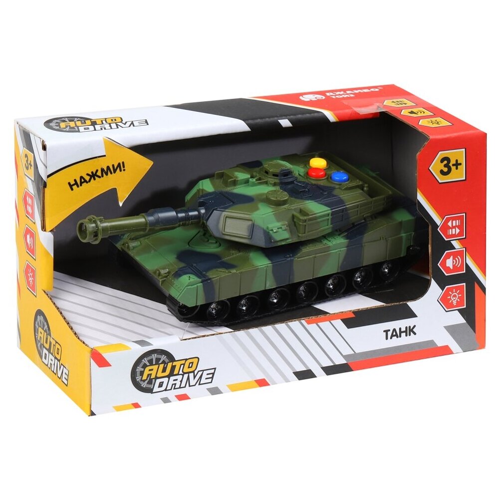 Инерционный танк на батарейках с фигуркой гонщика AUTODRIVE выглядит очень реалистично, а световые и звуковые эффекты сделают игровой процесс еще более увлекательным. Танк станет отличным дополнением к детскому автопарку Игры с транспортом тренируют: - визуальное и слуховое восприятие, - координацию движений, - внимание, - фантазию. Игрушка выполнена из качественных, безопасных для детского здоровья материалов. Цвет: камуфляжный Возраст: 3+ Размер упаковки: 29,5*12*15,5см Батарейки 3*AG13 вставлены в игрушку