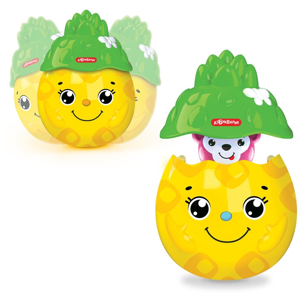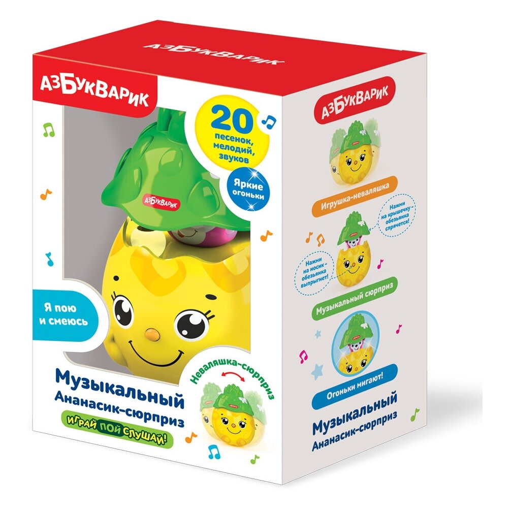 Игрушка-сюрприз порадует любого ребенка, особенно если этот сюрприз – музыкальный! Кто же прячется в большом ананасике? Нажми скорее на носик-кнопочку! Ух ты – это обезьянка! Продолжай нажимать на кнопочку – обезьянка споет 10 песенок и мелодий («Друзья», «Песенка про счёт», «Весёлые противоположности», «Пляшут весело детишки», «Бум Бум», «Весёлая карусель», «Песенка про кузнечика» и др.). Чтобы обезьянка обратно спряталась в домик-ананасик, нужно нажать на крышечку. А еще с ананасиком можно играть как с неваляшкой – раскачивать его в разные стороны!