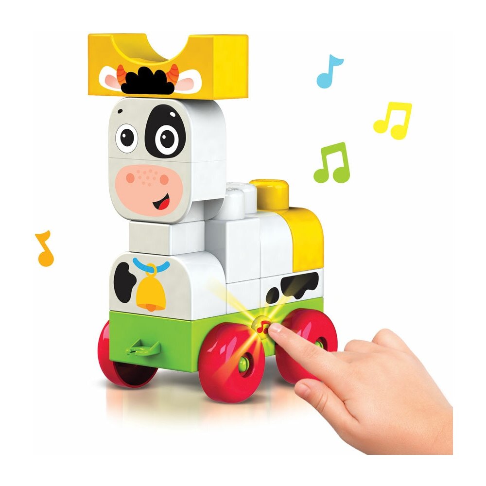 «Talky Blocks кнопочка» – это развивающий конструктор нового поколения. Крупные яркие детали разработаны специально для малышей, они легко соединяются и разъединяются. В игровом наборе «Коровка» малыш найдет 10 кубиков с картинками и музыкальную каталочку. Собери на музыкальной платформе-каталочке милую коровку с колокольчиком на шее. Нажми на нотку – игрушка оживет! Катай игрушку, слушай 10 песенок, мелодий и звуков. Все детали серии «Talky Blocks кнопочка» совместимы друг с другом! Соберите несколько наборов серии – и у вашего ребенка будет мегаконструктор! Он соединит всех зверят на колесиках вместе – и получится весёлый поезд. Но еще интереснее комбинировать детали из разных наборов и придумывать разных фантастических животных. Talky Blocks предлагает безграничные возможности для детского творчества!