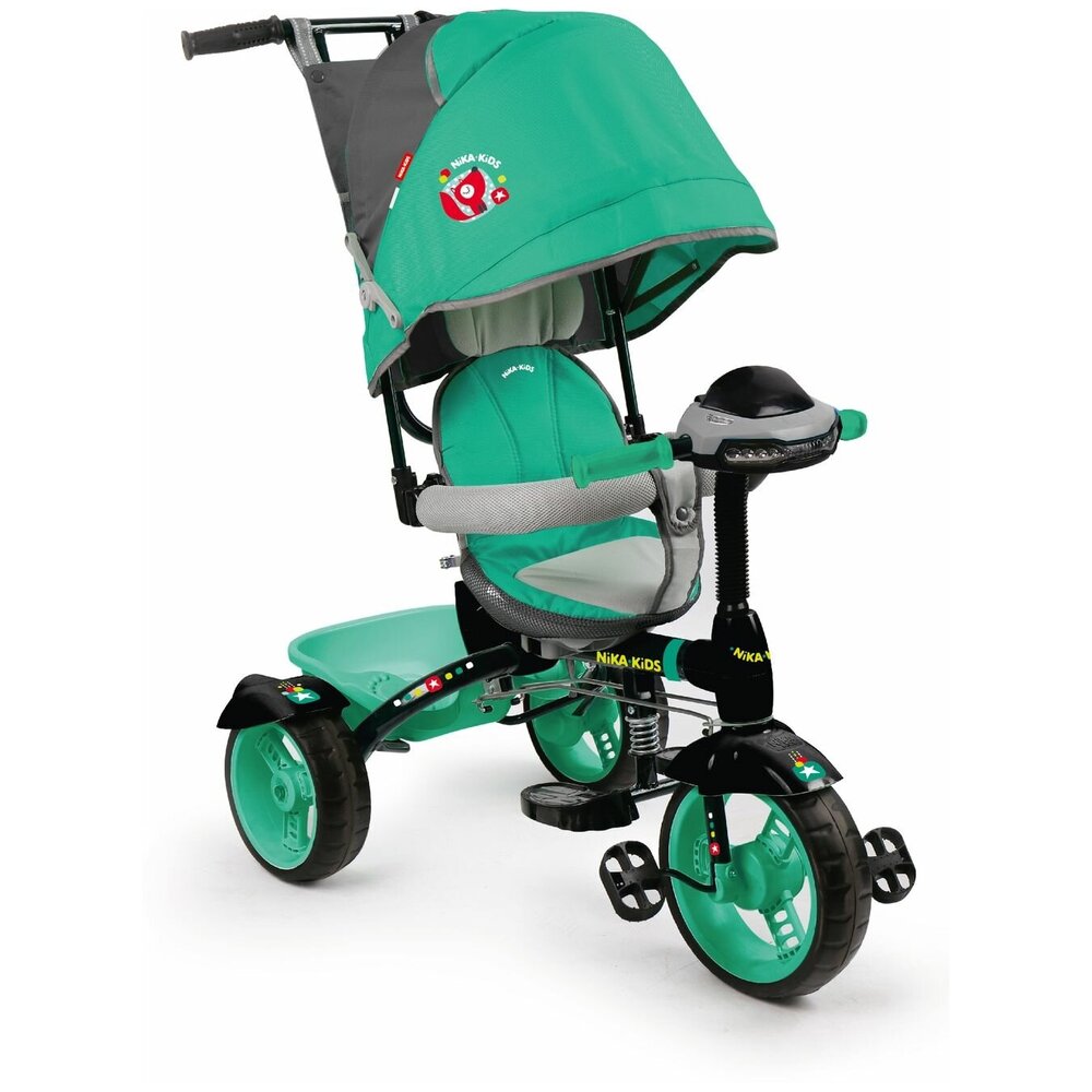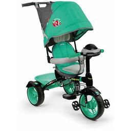 Велосипед детский прогулочный трёхколёсный предназначен для детей в возрасте от 1.5 до 4 лет. Сварной каркас из стальных труб, новый дизайн чехла, съёмная родительская ручка управления. Мягкий подголовник эргономичной формы, удобное эргономичное сиденье со спинкой имеет 2 положения: «лицом к маме» и «лицом к дороге». Складная крыша с фиксатором, складывающаяся подножка, сумочка для вещей, мягкие шины. Музыкальная приставка на руле (4 режима световых сигналов, 3 мелодии). Допустимая нагрузка не более 25 кг.
