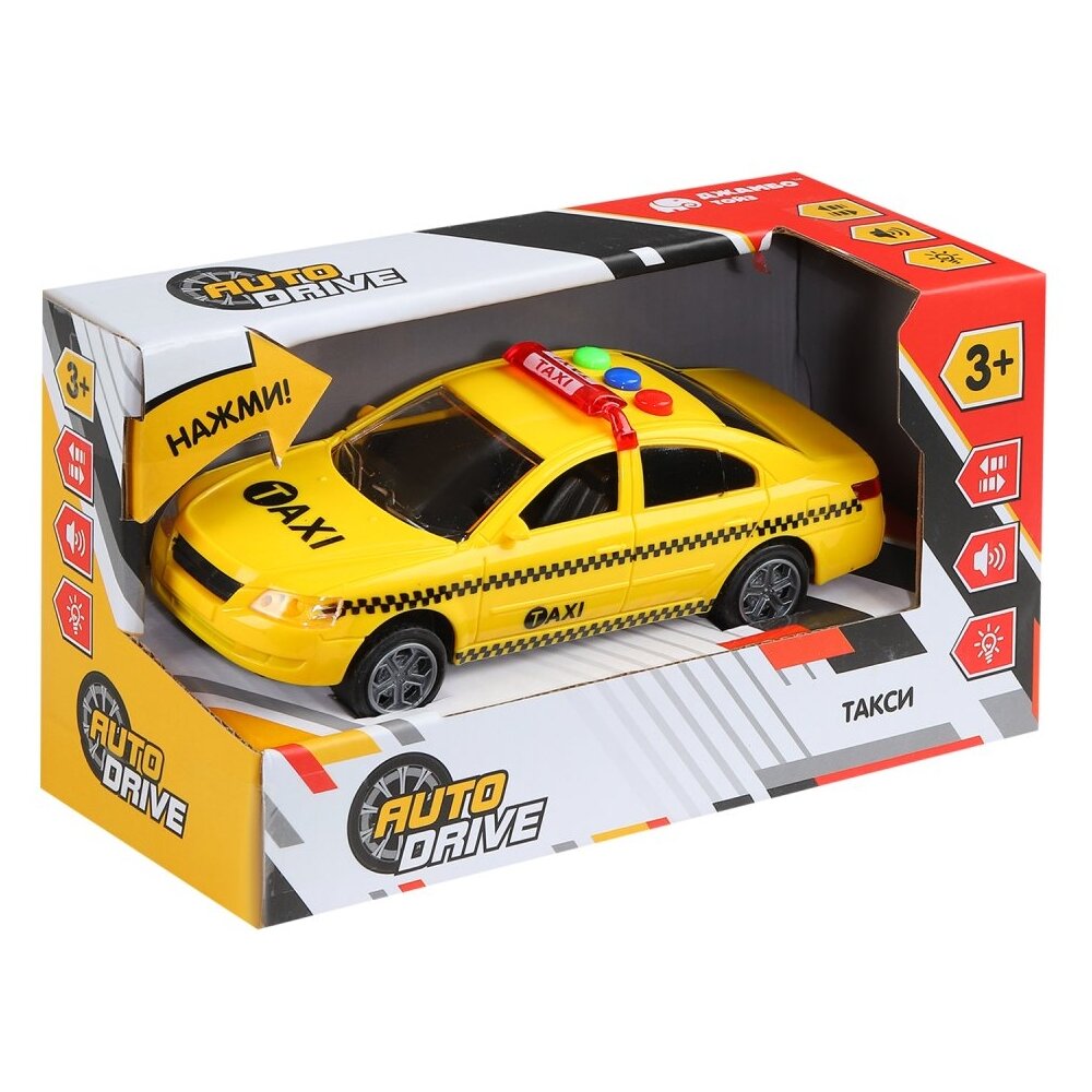 Инерционная машина такси на батарейках AUTODRIVE выглядит очень реалистично, а световые и звуковые эффекты сделают игровой процесс еще более увлекательным. С такой машинкой ребенок почувствует себя настоящим таксистом Благодаря инерционному механизму игрушка перемещается самостоятельно, стоит только немного подтолкнуть машину вперёд или назад, а затем отпустить, и она поедет сама. Игры с транспортом тренируют: - визуальное и слуховое восприятие, - координацию движений, - внимание, - фантазию. Игрушка выполнена из качественных, безопасных для детского здоровья материалов. Цвет: желтый Возраст: 3+ Размер упаковки: 19,5*8,5*10,5см Батарейки 3*AG13 вставлены в игрушку