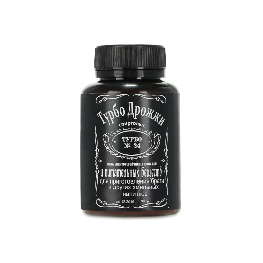 Дрожжи спиртовые «Турбо 24» - специальная смесь дрожжей для быстрого приготовления браги. Содержат в своем составе витамины, аминокислоты и различные макро- и микроэлементы, способствующие интенсивному сбраживанию сырья. Турбо дрожжи позволят добиться полного сбраживания сусла за 4 суток! Дрожжи «Турбо 24» прекрасно адаптированы к трудным условиям работы, спиртоустойчивы (крепость браги достигает 17-18 об.), отлично подходят для быстрого приготовления браги и дальнейшей дистилляции / ректификации. Дозировка и применение: Турбо дрожжи возможны к использованию с любым сырьем, способным к брожению. Для получения наилучшего результата, дрожжи необходимо активировать. Для этого необходимо добавить дрожжи в теплую воду (30°C) в пропорции 1:10 (90 грамм дрожжей:900 мл воды), тщательно перемешать. Затем добавьте дрожжевой раствор в раствор сбраживаемого сусла. Упаковки дрожжей Турбо 24 (90 грамм) достаточно для сбраживания 5 кг сахара и приготовления 30 литров браги. Брожение с использованием данных дрожжей происходит весьма интенсивно, кроме того, повышая дрожжевую дозировку Вы сможете ускорить процесс брожения вплоть до 24 часов. После полного сбраживания, брагу следует перегнать.