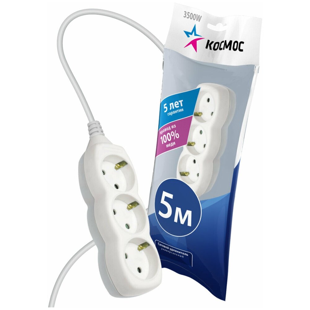 Бытовой удлинитель КОСМОС на 3 гнезда, длина шнура 5 метров. Диаметр сечения провода 3х1,0мм. Тип провода ПВС, номинальный ток 16А, максимальная мощность 3600Вт.