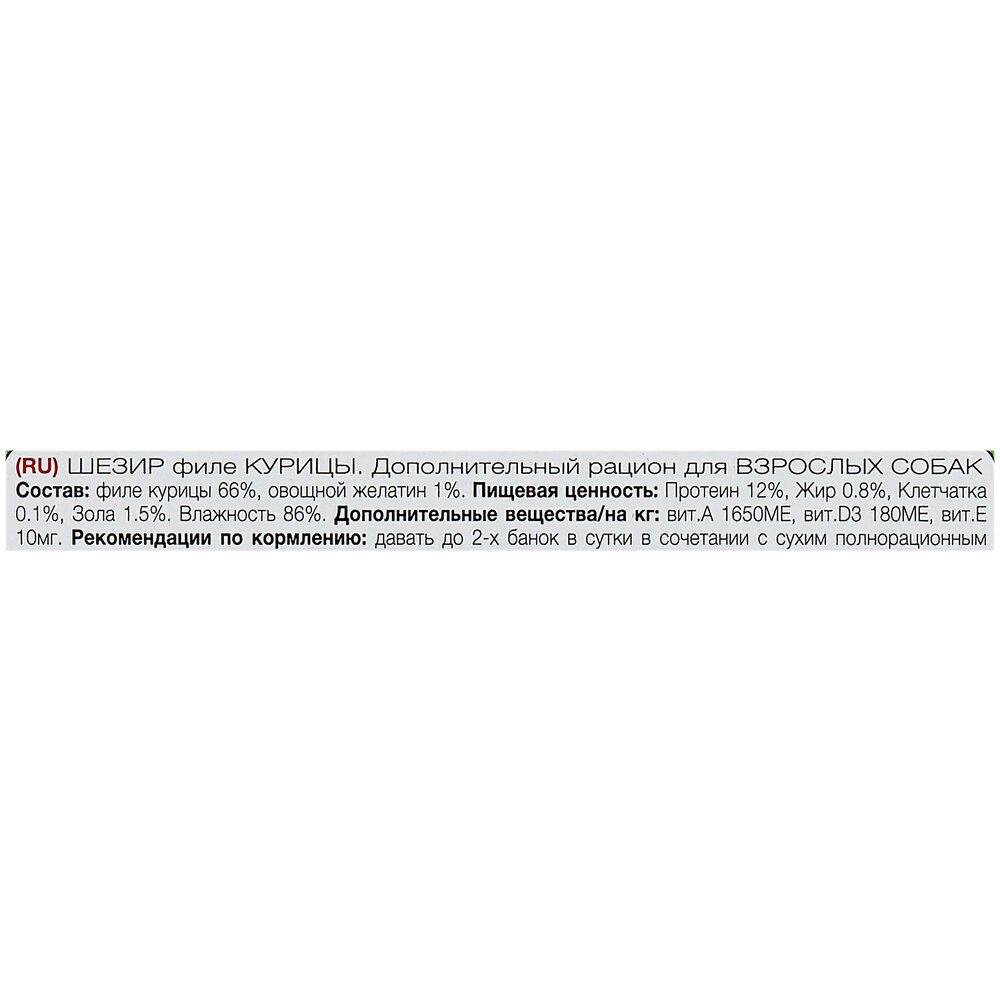 Консервы, выпущенные под брендом Schesir, предназначены для собак в возрасте от 1 года до 6 лет. Влажный корм изготовлен из отборных кусочков куриного филе, помещённых в овощной желатин. Курица выращена без использования гормонов и приготовлена паровым способом, позволяющим максимально сохранить в продукте все полезные вещества. Корм содержит большое количество необходимого для здоровья собак белка, обогащён витаминами А и Е. Он полностью удовлетворяет потребность домашнего питомца в энергии, помогает поддерживать иммунную систему, улучшает состояние кожи и шерсти. В состав консервов не входят стимуляторы аппетита, искусственные красители, консерванты и другие добавки, которые могут негативно сказаться на самочувствии животного. Продукция Schesir может служить основой ежедневного рациона или включаться в меню совместно с сухим кормом. Консервы расфасованы в порционные металлические баночки весом по 150 грамм. Благодаря кольцу на крышке они легко открываются вручную, без использования дополнительных инструментов. Компактную тару удобно брать с собой во время длительных поездок с домашним питомцем. Консервы продаются упаковками, в которые входят 10 банок.