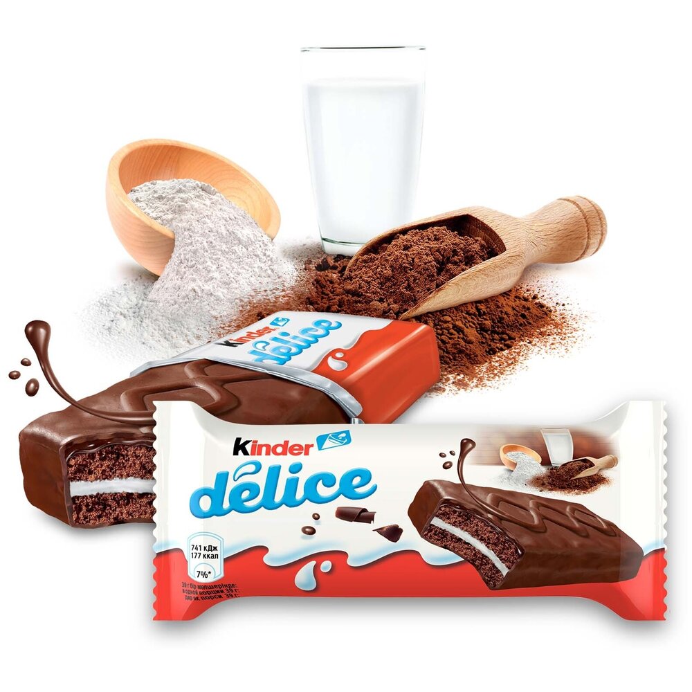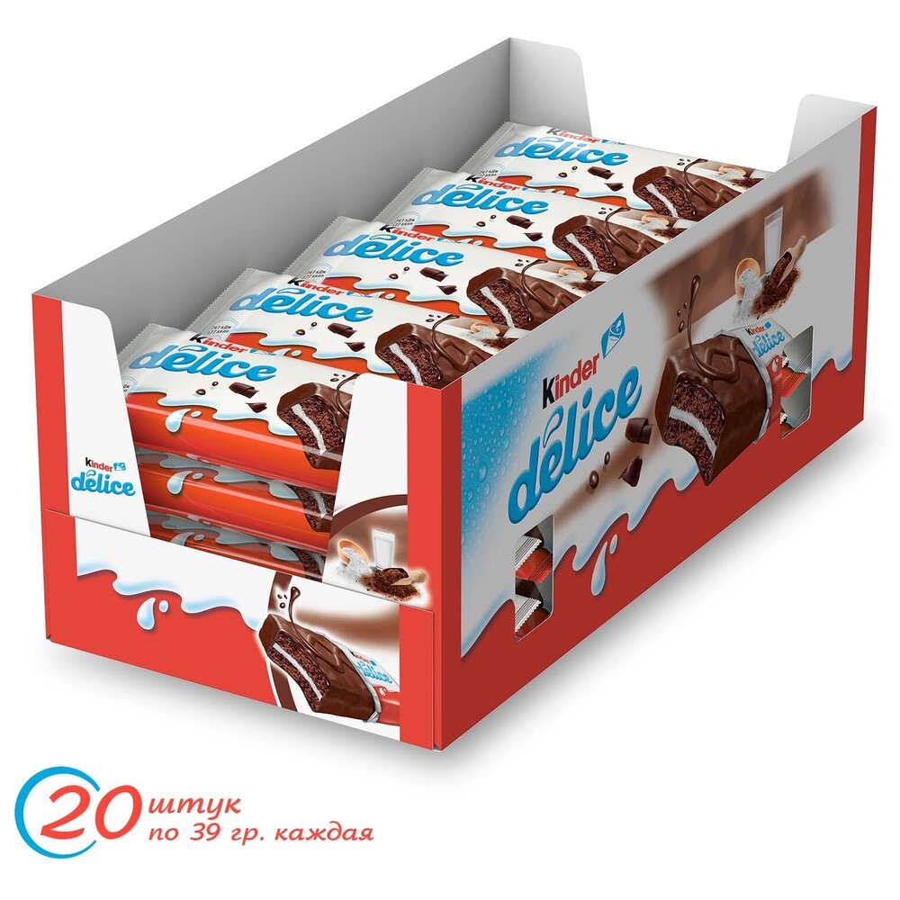 Kinder Delice - пирожное с молочной начинкой, покрытое какао-глазурью. Насыщенный шоколадный вкус бисквита гармонично дополняет мягкий молочный крем.<p>Небольшое пирожное удобно взять с собой в школу или на дополнительные занятия, чтобы подкрепиться в любой момент, ведь его не нужно хранить в холодильнике</p>