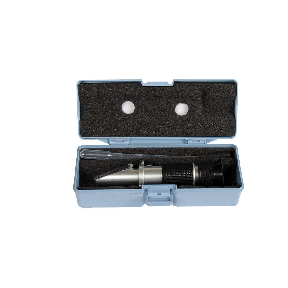 Назначение: - устройство, применяемое для определения физических свойств жидкости путем измерения показателя преломления света в граничащих средах. Позволяет определить плотность электролита аккумуляторной батареи, температуру замерзания жидкостей на основе пропиленгликоля или этилового спирта, а также температуру замерзания жидкости для омывателя. Комплектация: Пипетка для отбора; Салфетка для очистки; Отвертка для регулировки; Все упаковано в прочный пластиковый ящик. Применение: Измерение жидкости: Набрать пипеткой небольшое количество жидкости. Поднять рассеивающее стекло и капнуть 2-3 капли жидкости на призму прибора. Опустить рассеивающее стекло таким образом, чтобы тестируемая жидкость равномерно распределилась по поверхности призмы.