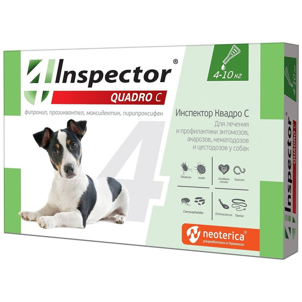 Инспектор Квадро С назначают собакам для лечения и профилактики энтомозов, демодекоза, отодектоза, саркоптоза, акарозов, вызываемых иксодовыми клещами, нематодозов желудочно-кишечного тракта (токсокароз, токсаскаридоз, унцинариоз, анкилостомоз, трихоцефалез), цестодозов (тениидозы, дипилидиоз, эхинококкоз, дифиллоботриоз, мезоцестоидоз), ассоциативных нематодо-цестодозных инвазий, а также в целях профилактики дирофиляриоза. Для уничтожения блох, вшей и власоедов и иксодовых клещей препарат, раздвинув шерсть, капельно («spot-on») наносят непосредственно на кожу в места, недоступные для слизывания – между лопатками у основания шеи.