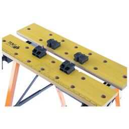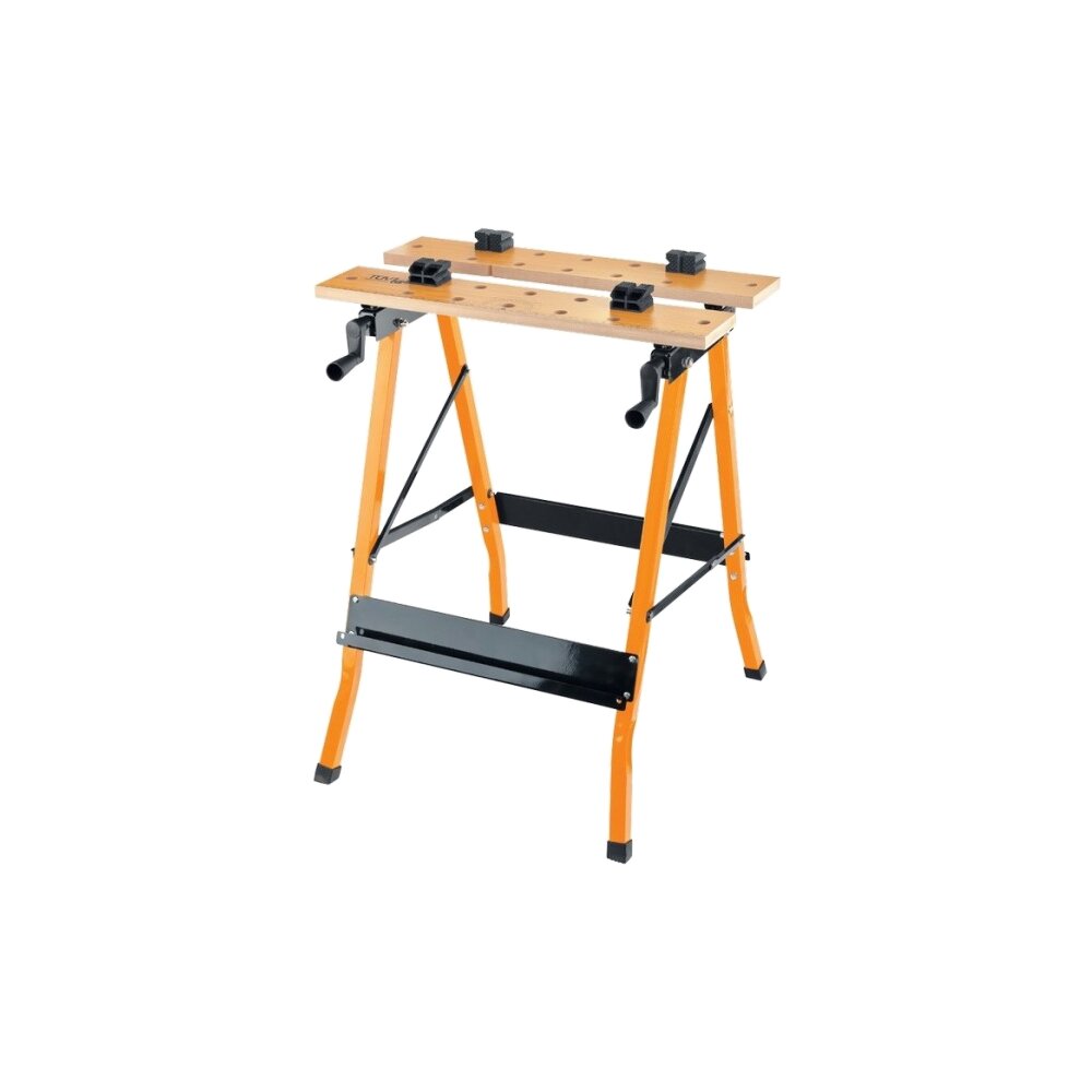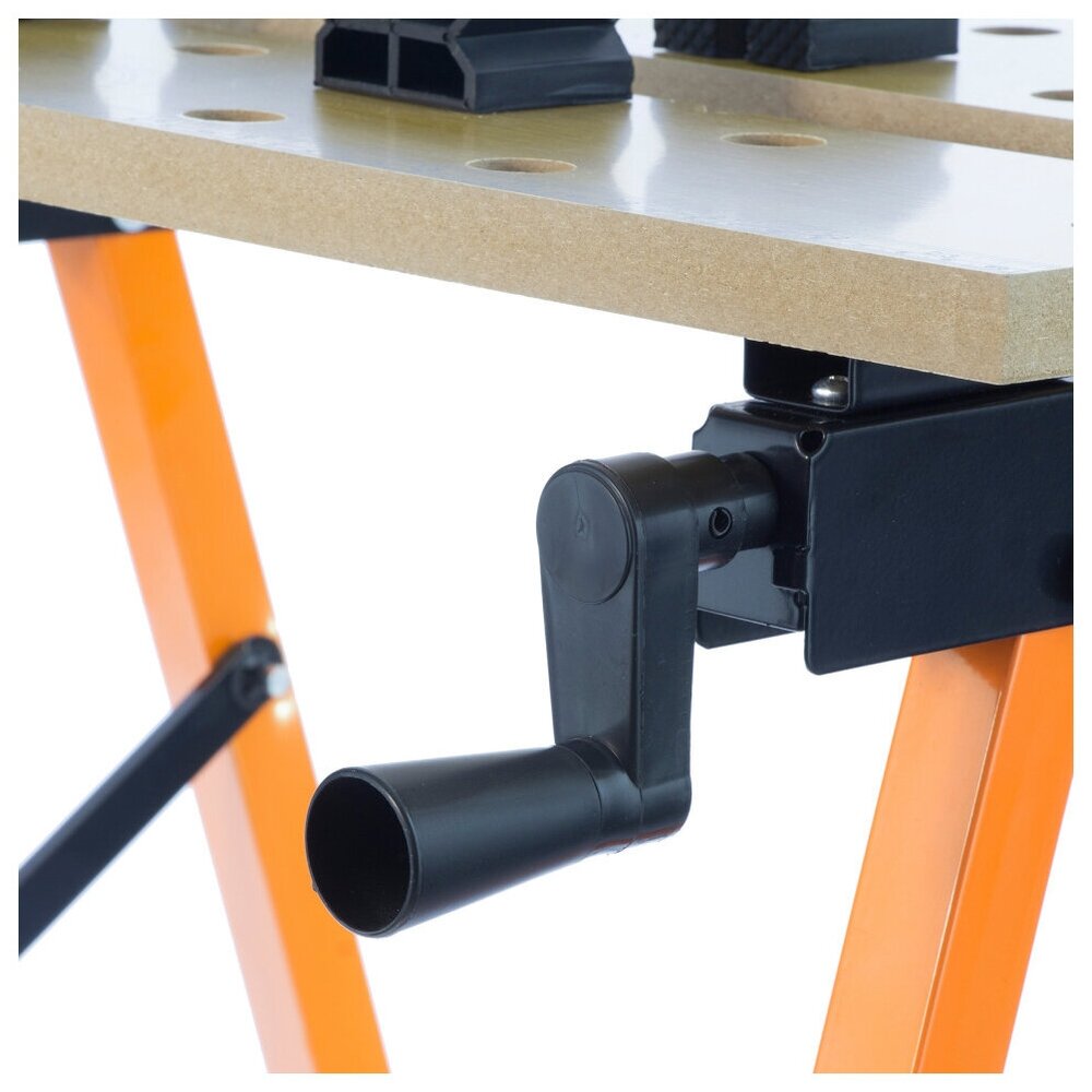 Верстак представляет собой складную металлическую конструкцию с раздвижной столешницей из МДФ, которая является одновременно и тисками. Это позволяет зажимать под разными углами заготовки обрабатывающий инструмент. Удобен в эксплуатации, имеет небольшие габаритные размеры. Специальная конструкция предусматривает хранение верстака в собранном виде, без демонтажа каких-либо элементов. Размер 880 х 135 х150 мм в собранном виде.