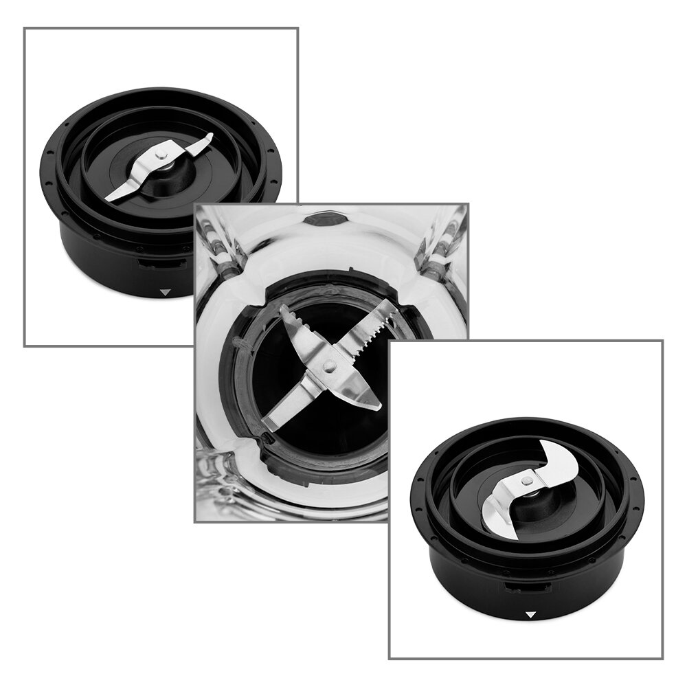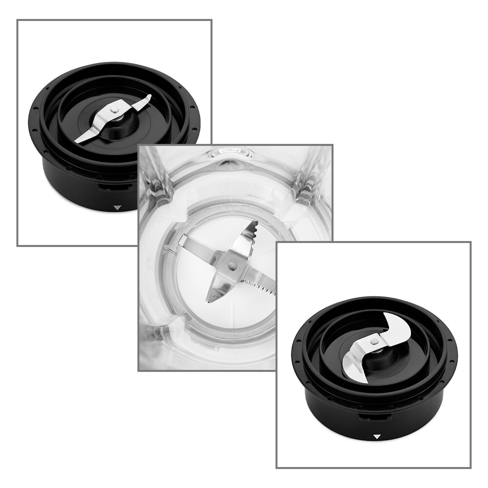 Блендер «3 в 1» КТ-3030 выполняет не только функции блендера, но также измельчителя и кофемолки! Он приготовит вкуснейшие смузи и коктейли. Измельчитель справится с мясом или овощами, а кофемолка с твёрдыми ингредиентами: например, с кофейными зёрнами. Блендер, кофемолка и измельчитель оснащены 4-лезвийными и 2-лезвийными блоками ножей. Лезвия выполнены из нержавеющей стали и отличаются своей силой, благодаря чему рубят продукты на высокой скорости вращения до 19 000 оборотов в минуту. Управление блендером осуществляется при помощи регулятора скорости. Переключение скоростей позволяет выбрать оптимальный способ смешивания различных ингредиентов. Под моторным блоком блендера находятся противоскользящие ножки. Они позволяют оставлять блендер на скользких поверхностях, не боясь, что он упадёт. Чаша блендера ёмкостью 1,8 л, кофемолки и измельчителя ёмкостью 0,25 л выполнены из прочного стекла. Устройство легко разбирается и позволяет тщательно промывать его детали. В крышке чаши блендера есть отверстие для добавления ингредиентов непосредственно во время работы. Колпачок отверстия может использоваться как мерный стакан на 100 мл.