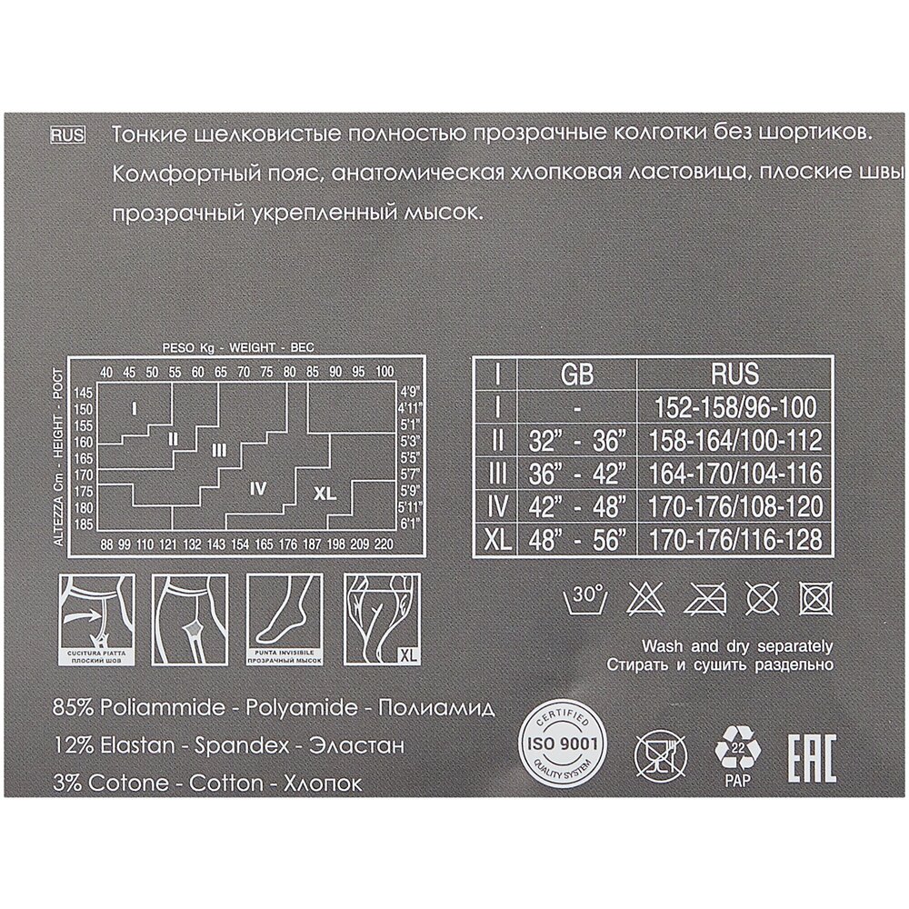 Тонкие шелковистые полностью прозрачные колготки без шортиков. Комфортный пояс, анатомическая хлопковая ластовица, плоские швы, прозрачный укреплённый мысок для выдающейся прочности и лучшего качества.
