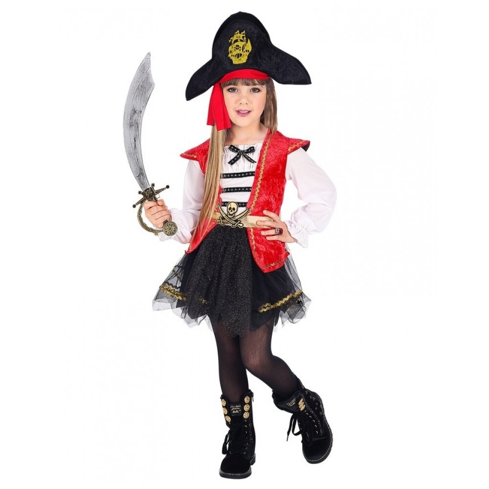 Детский костюм пиратки со шляпой Размер 116 см. Основной цвет - красный Персонаж - Пират, Разбойник В комплекте - платье, головной убор Материал - полиэстер