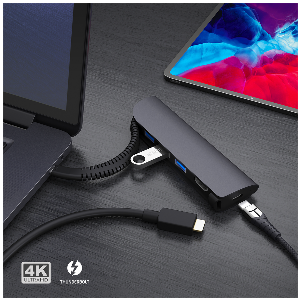 Назначение - позволяет одновременно подключить несколько устройств к разъему USB Type-C. Разъем USB 3.1 Type-C с функцией Power Delivery, 3 разъема USB 3.0 скоростью до 5Гбит/с, разъем HDMI с поддержкой видеосигнала 3840х2160/30Гц или 1920х1080/60Гц. Алюминиевый корпус с укрепленным прорезиненным кабелем подключения. Не нагревается от USB PD, не снижает скорость передачи. Ультранадежный и функциональный адаптер для MacBook Pro и Air (2016 и новее), iPad Pro (2018 и новее), PC / ПК с поддержкой Thunderbolt 3, смартфонов с поддержкой вывода видео через Type С. Габаритные размеры: 125 х 39 х 15 мм.