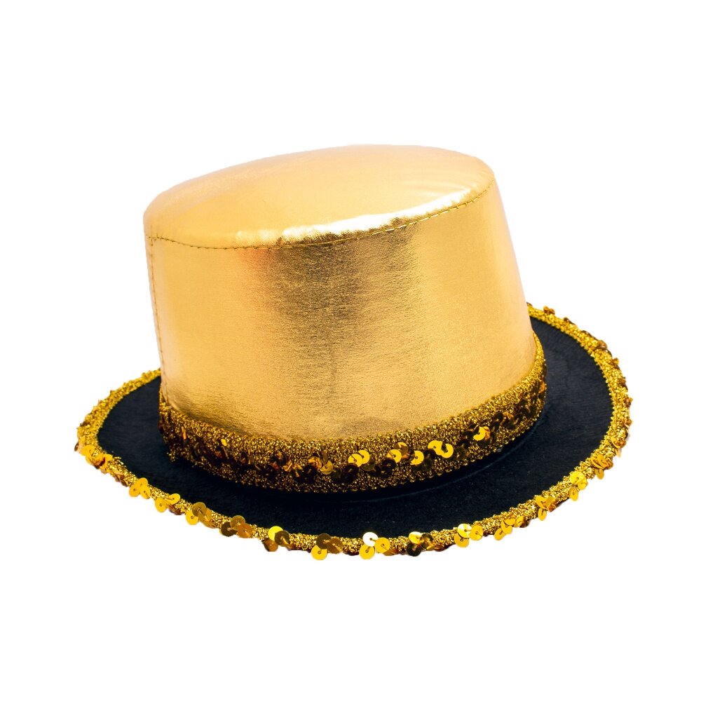 Золотой цилиндр Размер ⌀ 60 см. Цилиндр из золотой блестящей ткани. Поля шляпы декорированы кантом золотого цвета. Окружность цилиндра 60 см. Основной цвет - золотой Материал - пайетки