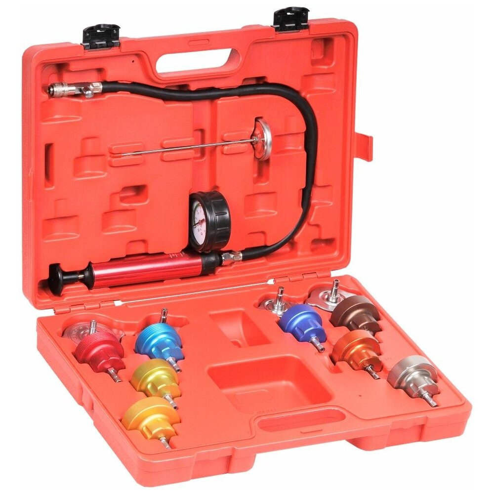 - Подробная комплектация -рабочий насос с быстросъёмным разъёмом, клапаном сброса давления и манометром; <br> -термометр аналоговый с длинным щупом; <br> -12 адаптеров заливных горловин радиаторов и расширительных бачков.