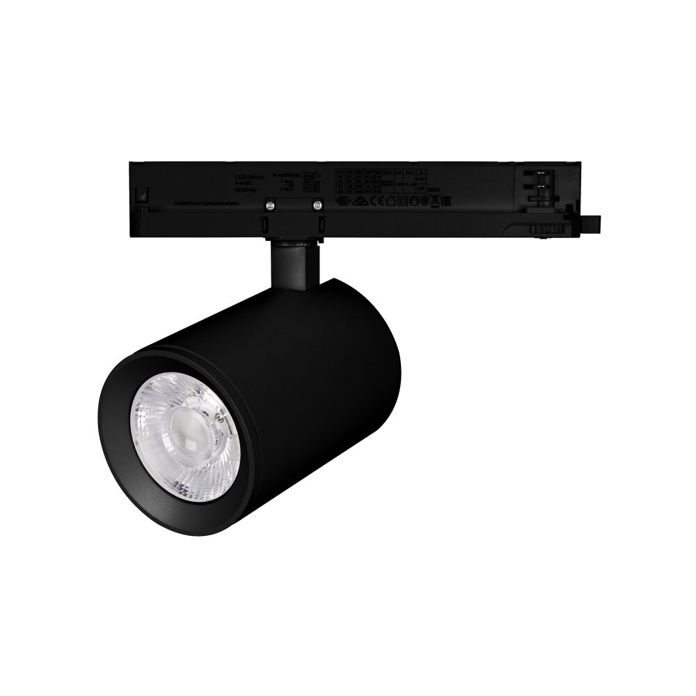 Светильник подвесной для треков/шин 4 провода, 30Вт. Цвет свечения БЕЛЫЙ ТЕПЛЫЙ 3000K, световой поток 3000лм, угол 24°, CRI>90. Корпус круглый, металл, цвет черный, IP20. Размеры DxH Ø100x105мм. Входное напряжение AC220-240V, мощность 30Вт. Драйвер встроенный в адаптер (30-40V, 850mA).