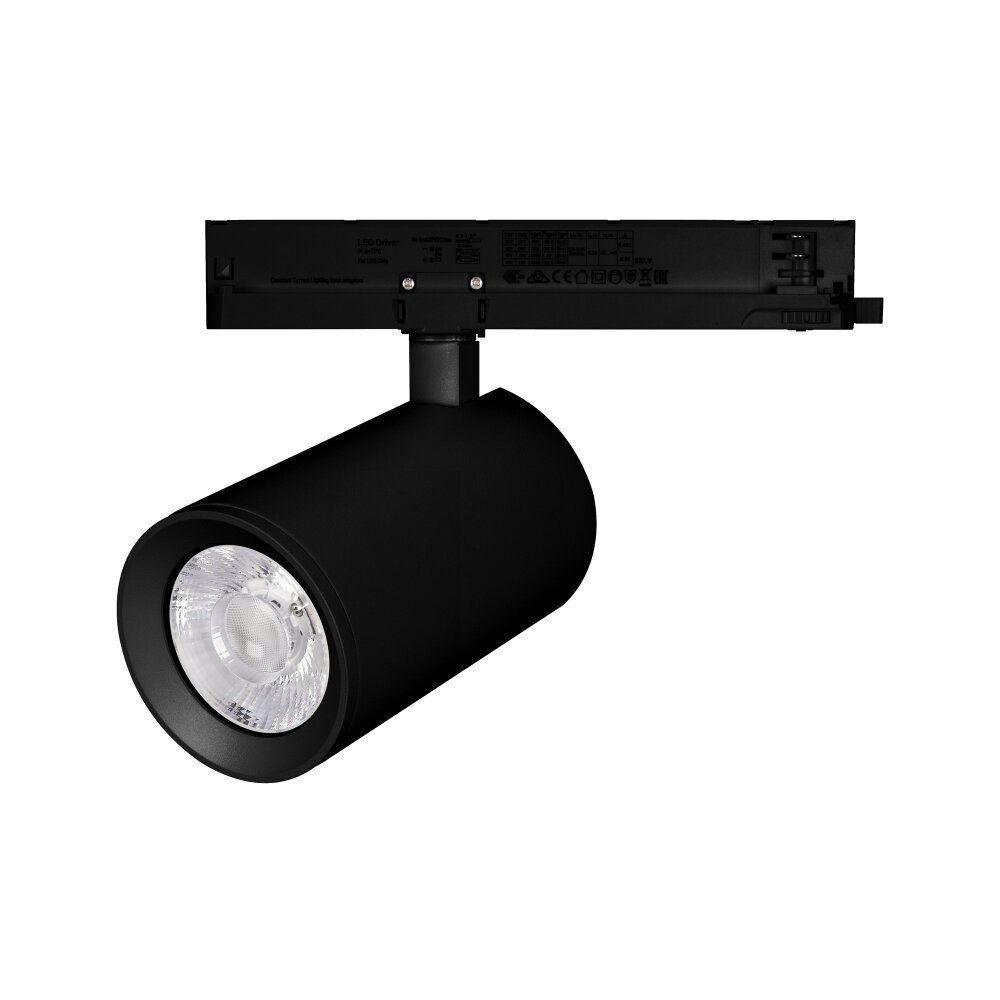Светильник подвесной для треков/шин 4 провода, 40Вт. Цвет свечения БЕЛЫЙ ТЕПЛЫЙ 3000K, световой поток 4000лм, угол 24°, CRI>90. Корпус круглый, металл, цвет черный, IP20. Размеры DxH Ø100x135мм. Входное напряжение AC220-240V, мощность 40Вт. Драйвер встроенный в адаптер (30-40V, 1000mA).