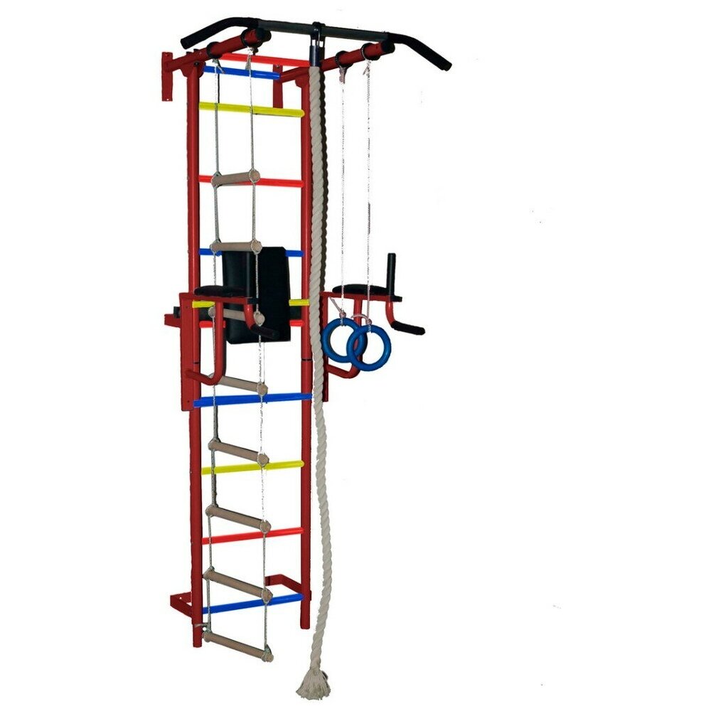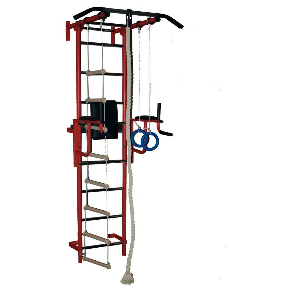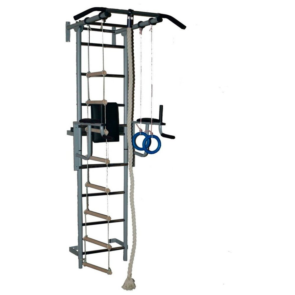Способ установки: к стене<br />\nМатериал: металл<br />\nВысота: 2,20 м<br />\nШирина комплекса: 0,49 м<br />\nЗанимаемая площадь: 1,0 х 0,95 м<br />\nДиаметр трубы: 38 мм<br />\nТолщина металла: 1,5 мм<br />\nДиаметр ступени: 26 мм<br />\nШирина ступени: 0,41 м<br />\nШаг ступени: 0,26 м<br />\nТип ступени: металл<br />\nДопустимая нагрузка на навесное оборудование: 50 кг<br />\nКомплектация: брусья навесные, канат, кольца, верёвочная лестница<br />\nДопустимая нагрузка: 100 кг<br />\nВозрастная категория: 3+<br />\nВес комплекса: 25 кг<br />\nУпаковка: полиэтилен<br />\nДопустимая нагрузка на турник: 100 кг<br />\nРасстояние от стены: 0,24 м