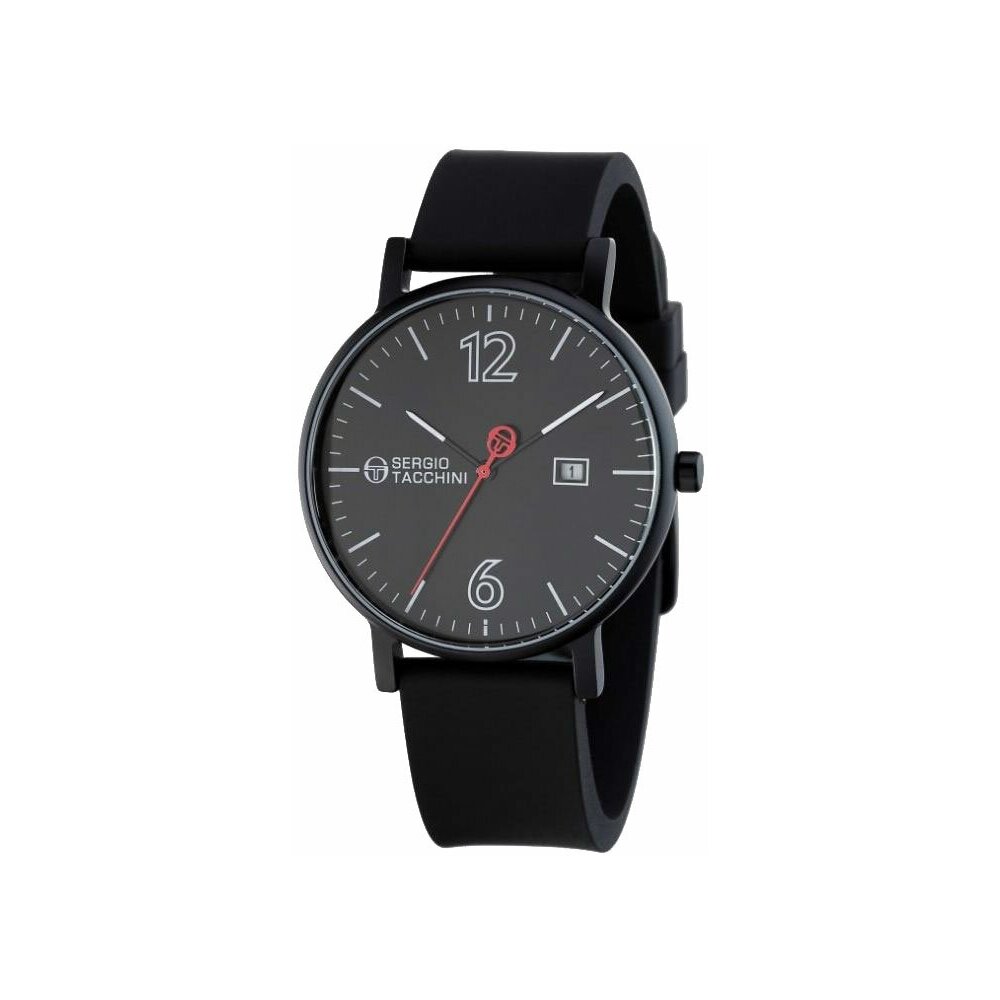 Sergio Tacchini. Корпус часов выполнен из стали. Безель тонкий. Ушки изящные и высокие. Циферблат часов выполнен в черном цвете с белыми индексами. Браслет черный полимерный с прочной застежкой. Люминесцентные стрелки. Окошко даты.