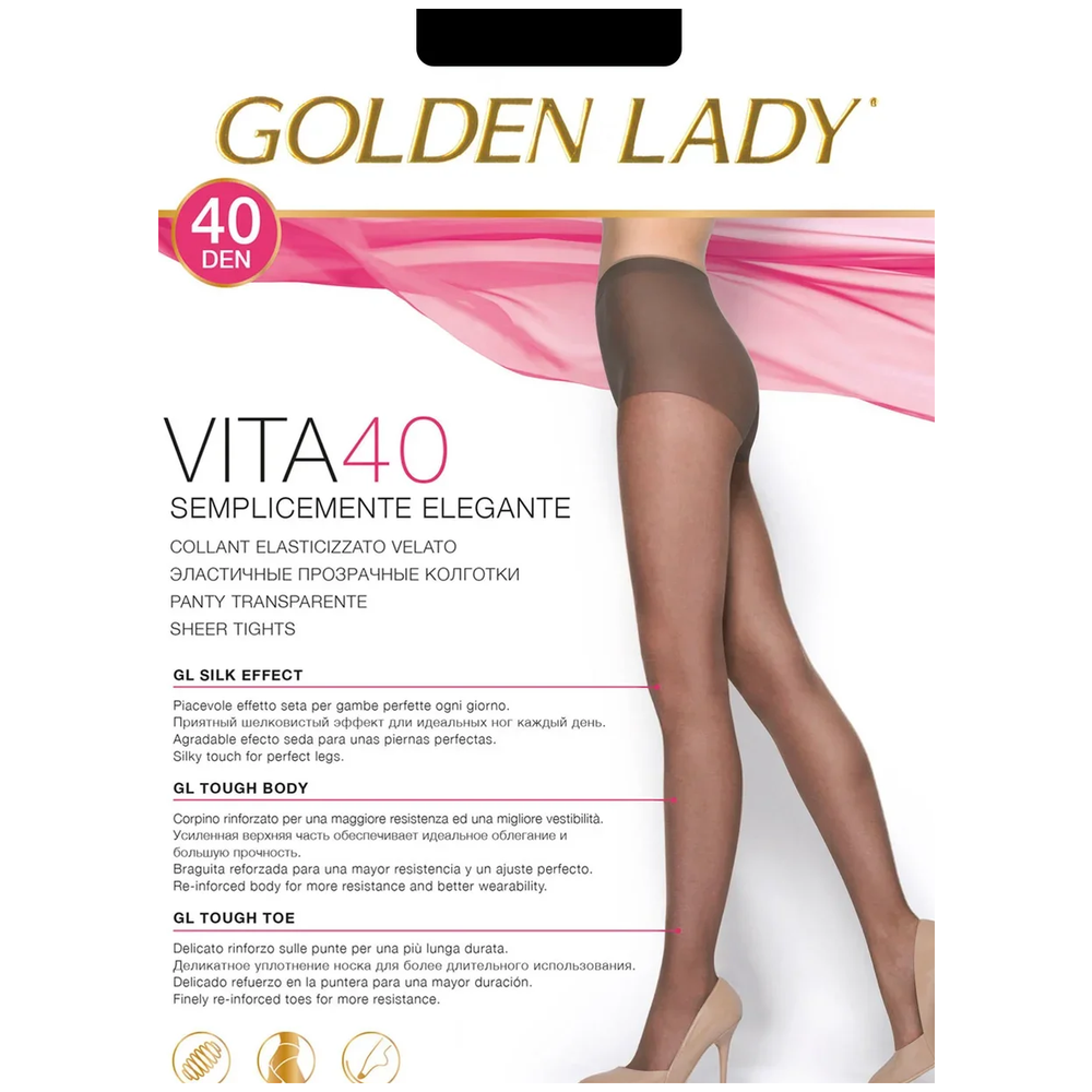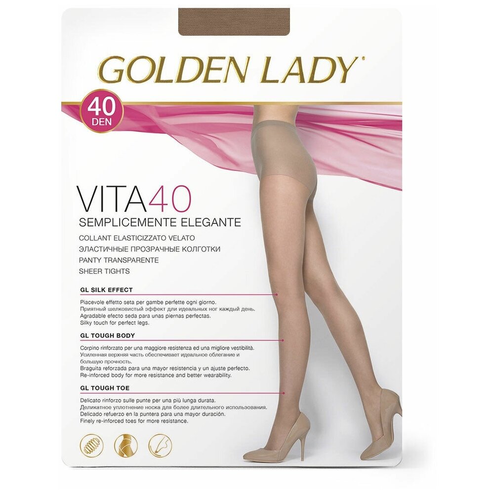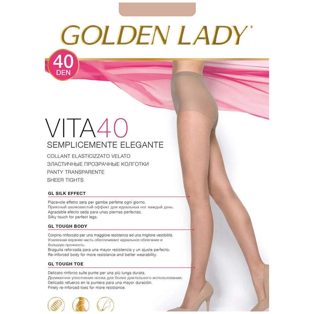 Женские колготки Golden Lady VITA на каждый день плотностью 40 ден с приятным шелковистым эффектом. С классической посадкой на талии. Без ластовицы. С шортиками, удобными швами, комфортным широким поясом и усиленными мысками.