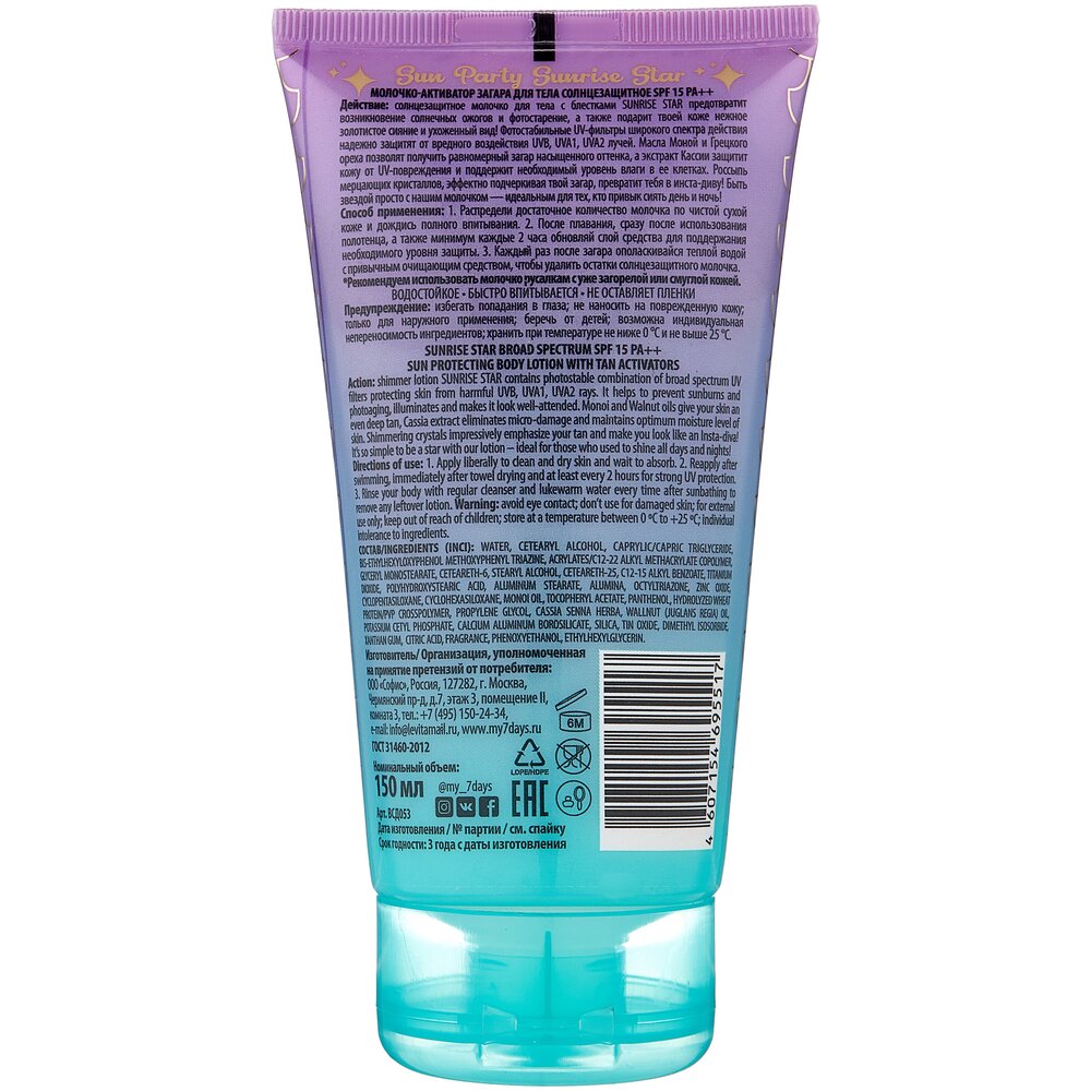 7DAYS Sun party Солнцезащитное молочко - активатор загара Sunrise Star SPF 15 150 мл
