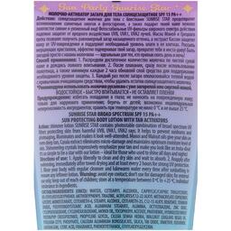 Солнцезащитное молочко для тела с блестками Sunrise Star предотвратит возникновение солнечных ожогов и фотостарение, а также придаст коже нежное золотистое сияние и ухоженный вид. Фотостабильные UV-фильтры широкого спектра действия надёжно защитят от вредного воздействия UVB-, UVA1-, UVA2-лучей. Масла моной и грецкого ореха позволят получить равномерный загар насыщенного оттенка, а экстракт кассии защитит кожу от UV-повреждения и поддержит необходимый уровень влаги в её клетках. Россыпь мерцающих кристаллов эффектно подчеркивает загар.