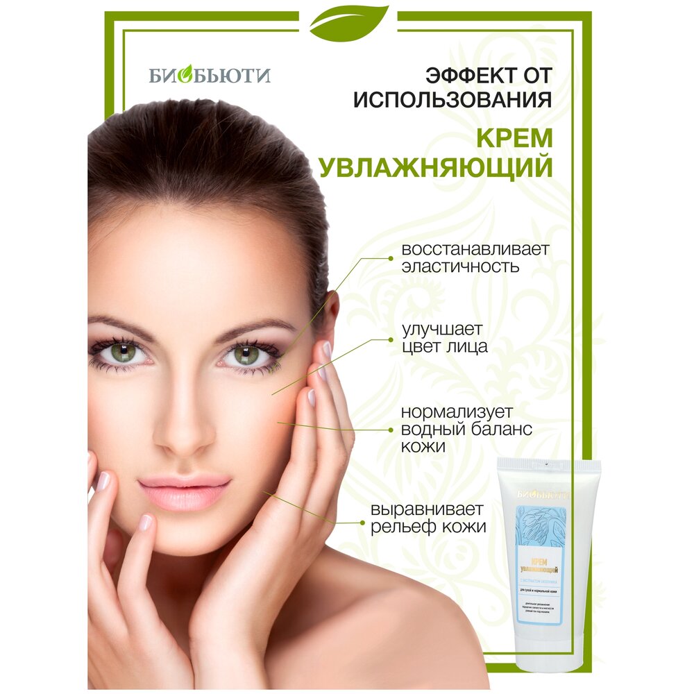 Крем Биобьюти «Увлажняющий», изготовленный из полезных природных компонентов, отлично питает сухую кожу лица. Крем подходит для ежедневного ухода, он используется в качестве основы под макияж. Средство дарит коже свежесть и легкость, оно устраняет шелушение, выравнивает цвет лица. Крем подходит для любого типа кожи – он удерживает влагу и обновляет клетки кожи. Крем восстанавливает функционирование сальных желез и решает проблему жирной кожи. Входящие в состав крема природные компоненты обеспечивают коже упругость, дарят ей здоровое сияние. Дневной крем «Увлажняющий» от Биобьюти - это питательный комплекс, в состав которого входит масло абрикоса и какао, вытяжка из молок лосося, экстракт окопника, минералы и другие полезные компоненты. Масло абрикоса насыщает кожу, наполняет ее полезными элементами. В молоках лосося содержатся аминокислоты и протеины, которые необходимы для устранения сухости. Масло какао дарит коже сияющий и здоровый вид. Экстракт окопника стимулирует выработку нового коллагена – он удерживает влагу и обеспечивает коже эластичность и мягкость. Также в состав увлажняющего крема входит масло герани – оно насыщает кожу влагой и способствует восстановлению поврежденных клеток. Эффект от использования крема: с помощью крема Биобьюти «Увлажняющий» нормализуется водный баланс, благодаря чему кожа выравнивается, ее цвет улучшается, разглаживаются морщинки. Кожа начинает сиять, она выглядит здоровой и красивой. Крем способен увлажнить даже самую сухую кожу, сделать ее мягкой и эластичной. Крем для лица Биобьюти «Увлажняющий» – это дневной крем, который подходит для ежедневного ухода за женской и мужской кожей. Средство также может использоваться в качестве ночного крема, оно оказывает положительное воздействие на кожу лица в любое время суток.