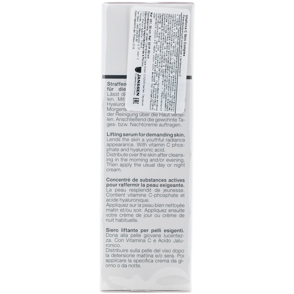 JANSSEN Demanding Skin Vitaforce C Skin Complex - Регенерирующий Концентрат с Витамином СVitaforce C Skin Complex от Janssen Cosmetics с высокоэффективными активными компонентами для борьбы с первыми признаками старения кожи: морщинами, вызванными сухостью, и тонкими линиями. Сочетание низко- и высокомолекулярной гиалуроновой кислоты обеспечивает заметное разглаживание кожи и пролонгированное повышение содержания влаги в верхних слоях эпидермиса. Витамин С фосфат (стабилизированная форма витамина C) проникает глубоко в ткани кожи, где превращается в активный витамин С.В фокусе три действия:В дерме витамин С стимулирует синтез нового коллагена и, таким образом, замедляет старение кожи. Снаружи это заметно благодаря повышению гладкости кожи.УФ-излучение и табачный дым способствуют образованию свободных ради- калов. Витамин С является очень мощным антиоксидантом, защищающим кожу от деструктивного воздействия свободных радикалов и, следовательно, предотвращает старение кожи.Витамин С подавляет синтез естественного пигмента кожи – меланина. Благодаря этому кожа становится светлее, возрастные пятна менее выраженными, тон кожи выравнивается. Кожа выглядит молодой и сияющей. Освежающий и ревитализирующий экстракт лимона поддерживает светлый тон и сияние кожи.Активные компоненты:Витамин С фосфат: антиоксидант, активизирует межклеточный обмен, стимулирует синтез белка, в частности коллагена, укрепляет стенки сосудов и осветляет возрастные пятна, подавляя синтез меланина.Гиалуроновая кислота (с длинной и короткой цепью): мгновенное заметное разглаживание кожи и повышения уровня ее увлажнения; исчезают морщины, вызванные сухостью.Экстракт лимона: освежает, тонизирует и ревитализирует кожу.Способ применения: Используйте курсом утром и/или вечером. Распределите небольшое количество продукта (2-3 нажатия диспенсера) по чистой коже лица до полного впитывания, затем нанесите подходящий дневной или ночной крем.В салоне применяется согласно регламенту процедур как активное средство(под массажный крем, под коллагеновую и пластифицирующую маски), а также в финале ухода.Результат: Vitaforce C Skin Complex от Янссен Косметикс освежает, выравнивает тон и придает коже сияние, нейтрализует свободные радикалы. Защищает кожу от преждевременного старения. Стимулирует синтез коллагена и эластина.