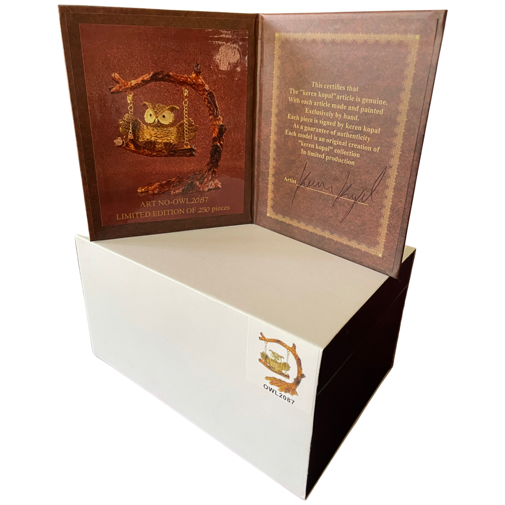 Лимитированная серия из 250 штук С индивидуальным номером И сертификатом соответствия изысканная фигурка-шкатулка ручной работы В стиле фаберже, декорированная австрийскими кристаллами. Keren Kopal – одноимённый бренд известного израильского дизайнера ювелирных произведений искусства Керен Копал. Это уникальное изделие создано под художественным контролем Керен и по её эскизам, искусными мастерами ежегодно выпускающими неповторимые лимитированные коллекции: шкатулок для украшений, статуэток, фигурок, музыкальных каруселей и пасхальных яиц в стиле Фаберже, которые призваны украсить Вашу жизнь. артикул: OWL2087 Размер изделия: 11,0 см х 5,8 см х 12,2 см (Д х Ш х В) Изготовлено вручную под дизайнерским контролем Керен Копал Покрыто золотом 24 карата или стерлинговым серебром 925 пробы Каждый кристалл подобран и художественно размещён мастером вручную Шкатулка имеет надёжный магнитный замок Каждое изделие упаковано в элегантную чёрную коробку Все изделия выполнены и окрашены исключительно вручную, с помощью уникального способа производства, сочетающего оригинальную технику эмали и филигранную инкрустацию Австрийскими кристаллами Каждая шкатулка маркирована металлической пластиной с подписью дизайнера в качестве гарантии подлинности В комплекте фирменный сертификат соответствия