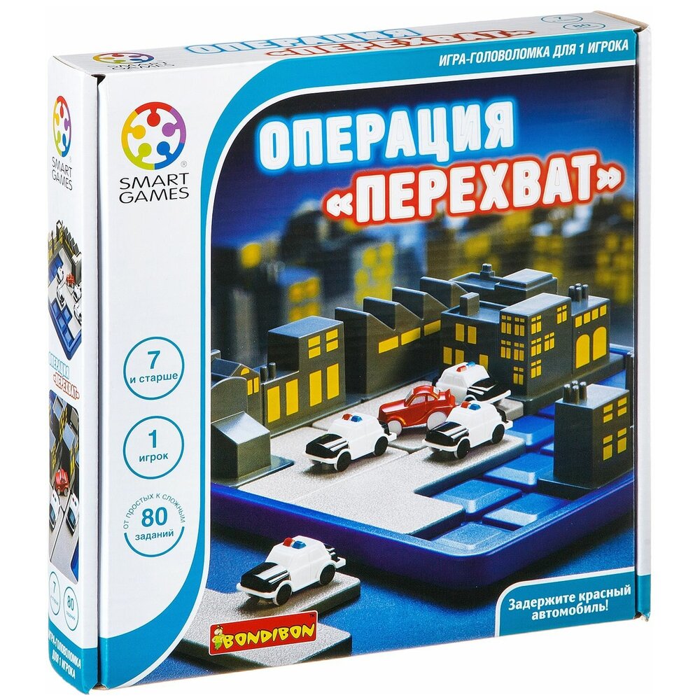 Операция Перехват – увлекательная игра для детей и взрослых! В комплект игры входит специальное игровое поле, красный автомобиль преступника, шесть полицейских расчётов, макеты зданий и буклет с заданиями и подсказками на русском языке.