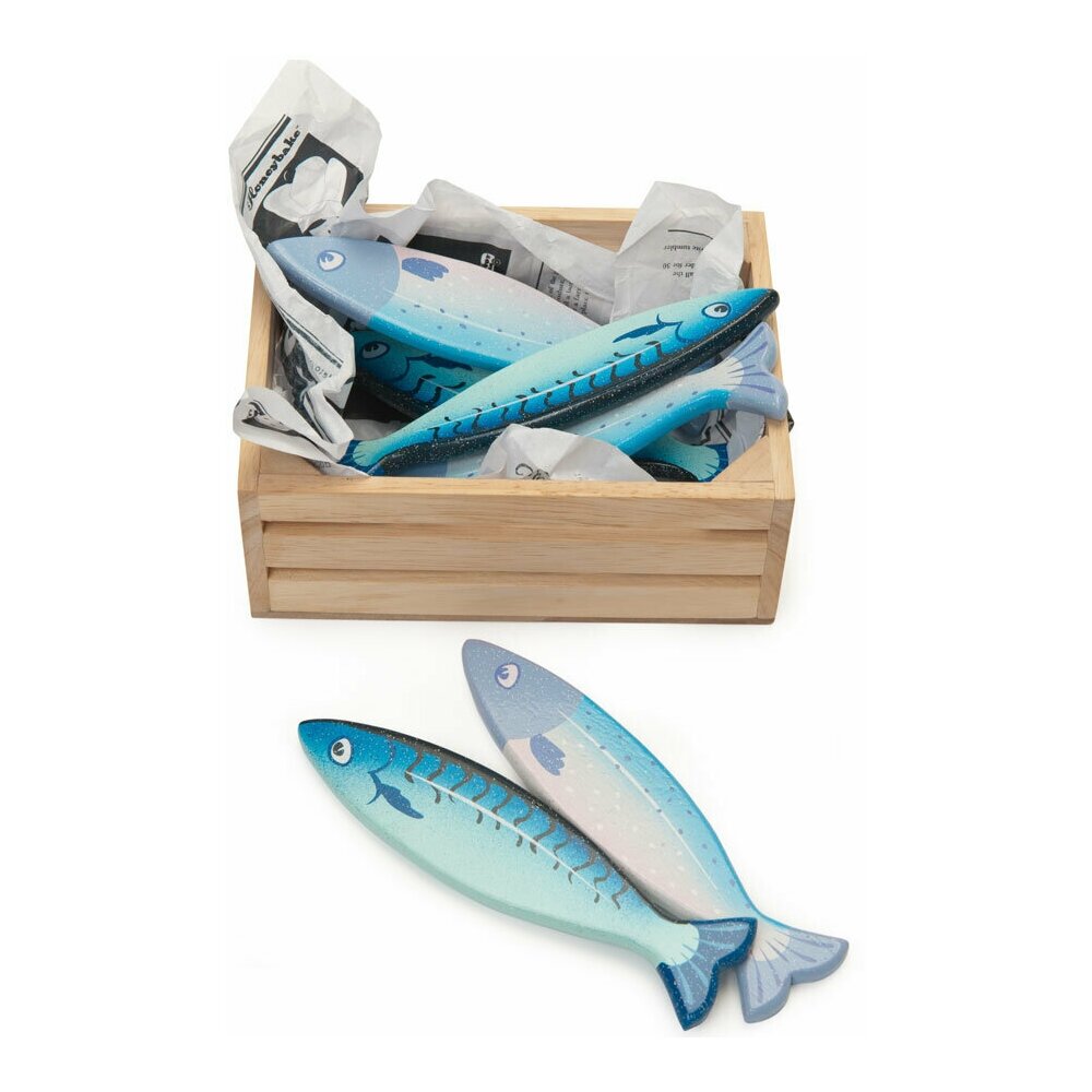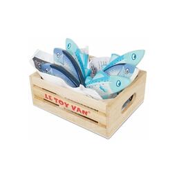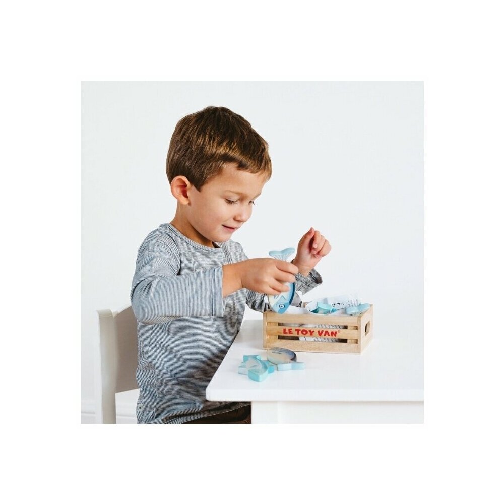 Игрушечная еда "Свежая рыбка", производства английской компании Le Toy Van. Яркие игрушечные рыбки в ящике могут пригодиться во многих сюжетных играх. Этот ящик вполне может стоять на прилавке игрушечного магазина или на кухне у домашней хозяйки. Если кухня - это традиционно игрушка для девочки, то продавцом может быть и мальчик. Играя в магазин, ребенок приобретает множество необходимых знаний и навыков, необходимых ему в повседневной жизни: считать деньги и товары, взвешивать. На ценнике за рыбку может стоять сумма за килограмм или за штуку. Все предметы сделаны из дерева. При производстве используются краски безопасные для детей.