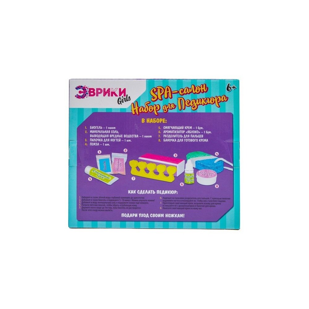 Красота и наука в одном флаконе «Эврики Girls» — наборы, которые научат девочку ухаживать за собой, а также помогут провести первые опыты по химии. С этим комплектом юная леди устроит спа-салон на дому и сделает себе идеальный педикюр. В набор входит: биогель, минеральная соль, пилочка для ногтей, пемза, смягчающий крем, яблочный ароматизатор, разделитель для пальцев, баночка для готового крема. Приступаем к педикюру Наберите в тазик тёплую воду примерно до уровня щиколотки. Засыпьте туда биогель и подождите 5–10 минут. Можно опускать ножки! Добавьте минеральную соль и подождите ещё немного. Потрите пяточки пемзой, чтобы убрать огрубевшую кожу. Держите ноги в воде до тех пор, пока биогель не растворится. После этого можно её выливать. Наденьте на пальчики разделители. Подпилите и отполируйте ногти. Приготовьте смягчающий крем: возьмите основу и смешайте её с ароматизатором. Нанесите крем на кожу ног. Все компоненты полностью безопасны для ребёнка.