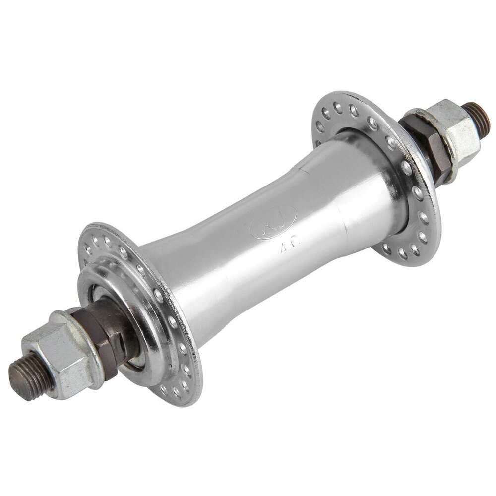 Втулка передняя KT-122F, на 28 спиц, под гайку, O.L.D. 100 мм, диаметр фланцев по отверстиям для спиц 38 мм, расстояние между фланцами 69 мм, ось 3/8"х140мм, стальной корпус, хромированная, 250 г