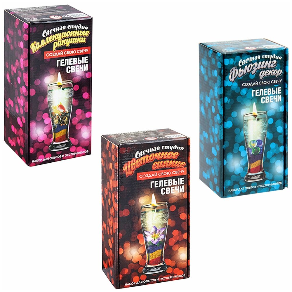 Новый набор для творческих личностей - "Коллекционные ракушки". В комплект входят красивые морские ракушки, песок трех цветов (красный, синий, желтый), фитиль, изящный стакан, а также гель, сваренный из натуральных компонентов. Все эти элементы предназначены для изготовления дизайнерской гелевой свечи, способной украсить интерьер любого помещения. Набор "Цветочное сияние" из серии "Свечная студия" порадует как взрослых любителей поделок, так и творческих ребятишек. В комплект входят такие декоративные элементы, как разноцветный песок трех видов и искусственный цветок. Также в наборе прозрачный стеклянный стакан (подсвечник), фитиль и гель из натуральных компонентов, обеспечивающий ровное, безопасное горение. Новый набор "Фьюзинг декор" будет пользоваться популярностью среди любителей хэндмейда. В комплект входит разноцветный песок, фитиль, гель для горения, стаканчик из стекла, а также красивые радужные камешки, изготовленные из стекла по технологии фьюзинга (спекания). Набор упакован в глянцевую картонную коробку с изображением изделия и подробной инструкцией на обратной стороне.