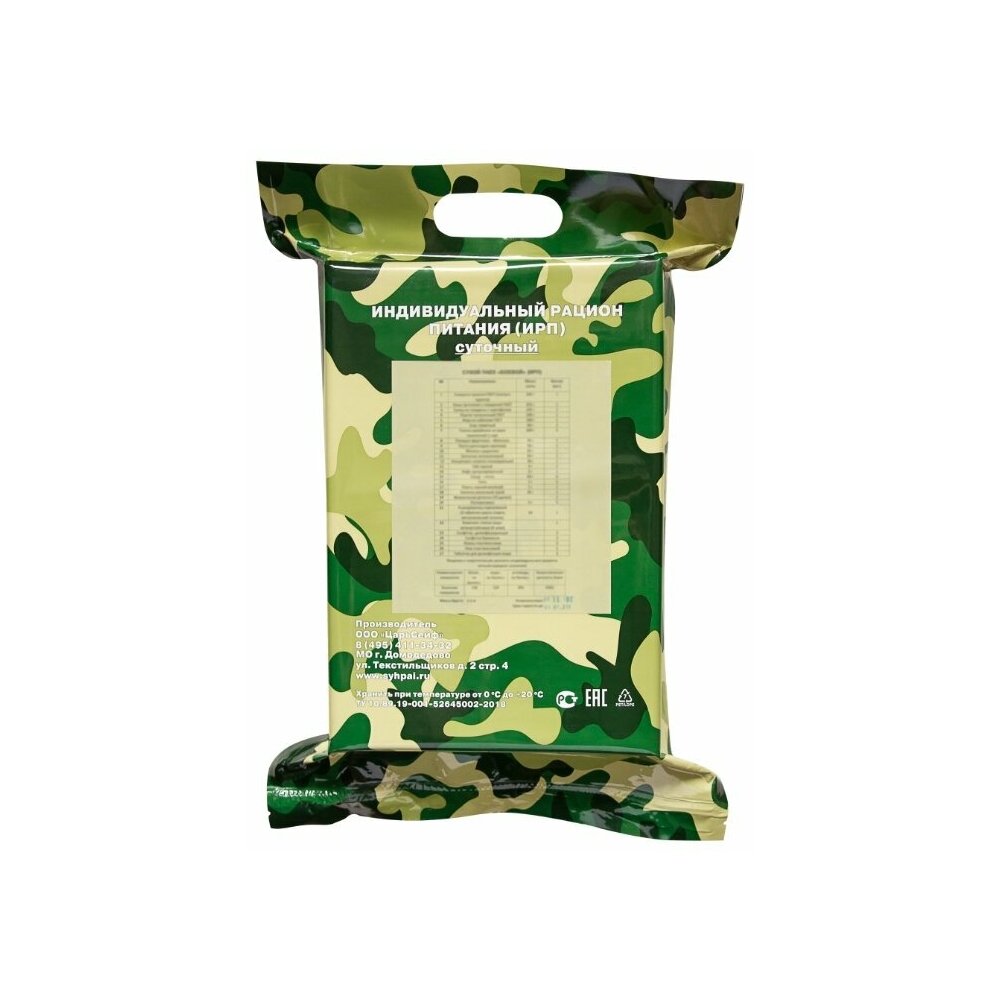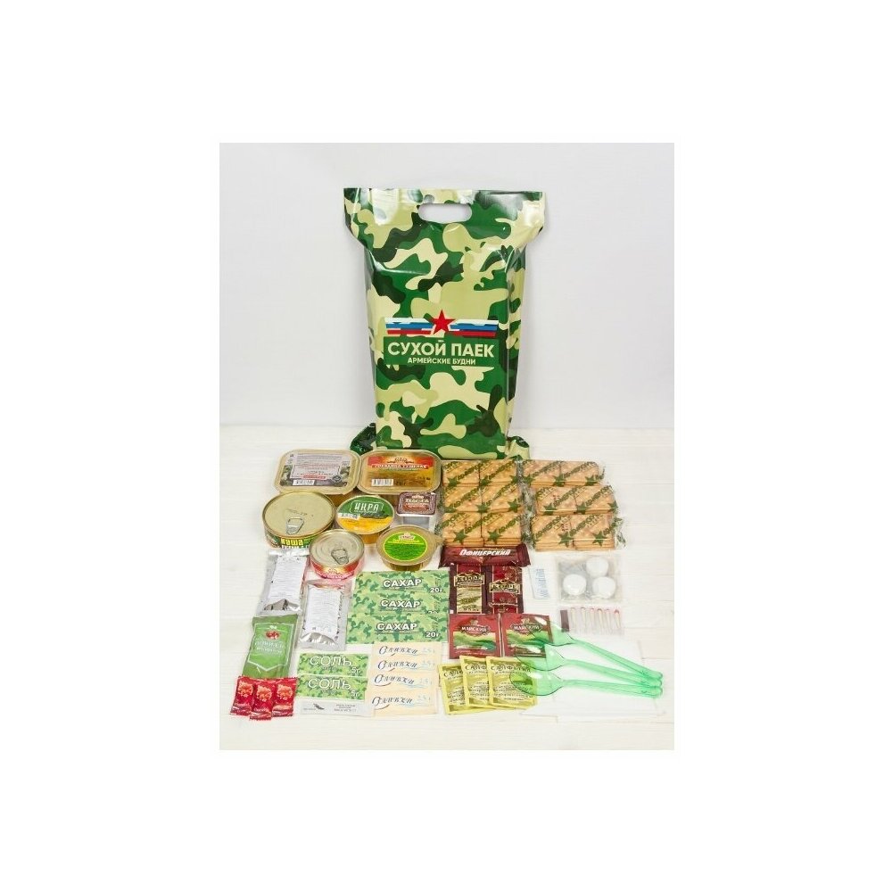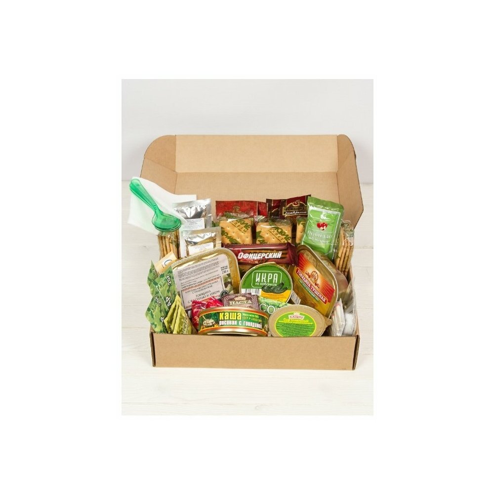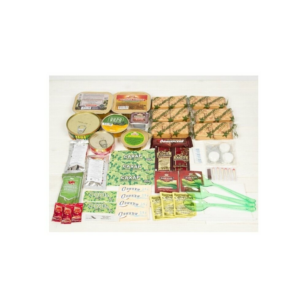 Состав : Говядина тушёная Гост (высший сорт) 250 г - 1 шт. Картофель тушёный с мясом 250 г - 1 шт. Каша рисовая с говядиной Гост 250 г - 1 шт. Фарш колбасный любительский 100 г - 1 шт. Икра из овощей Гост 100 г - 1 шт. Сыр плавленый 80 г - 1 шт. Галеты армейские из муки пшеничной 1 сорта 300 г - 6 шт. Повидло фруктовое-яблочное 45 г - 1 шт. Шоколад офицерский 30 г - 1 шт. Концентрат напитка тонизирующий 60 г - 2 шт. Напиток молочный 30 г - 1 шт. Кетчуп томатный 30 г - 1 шт. Чай чёрный 4 г — 2 шт. Кофе гранулированный 4 г - 2 шт. Сахар-песок 60 г — 3 шт. Соль 10 г - 2 шт. Перец чёрный молотый 1 г -1 шт. Сливки сухие 10 г - 4 шт. Жевательная резинка 1 драже - 3 шт. Разогреватель портативный (3 таблетки сухого спирта,металлический таганок) 50 г - 1 уп. Комплект спичек водо-ветроустойчивых (6 штук) - 1 уп. Таблетка для дезинфекции воды - 3 шт. Салфетка дезинфицирующая для рук - 3 шт. Салфетка бумажная - 3 шт. Ложка пластмассовая - 3 шт. Нож пластмассовый - 1 шт.