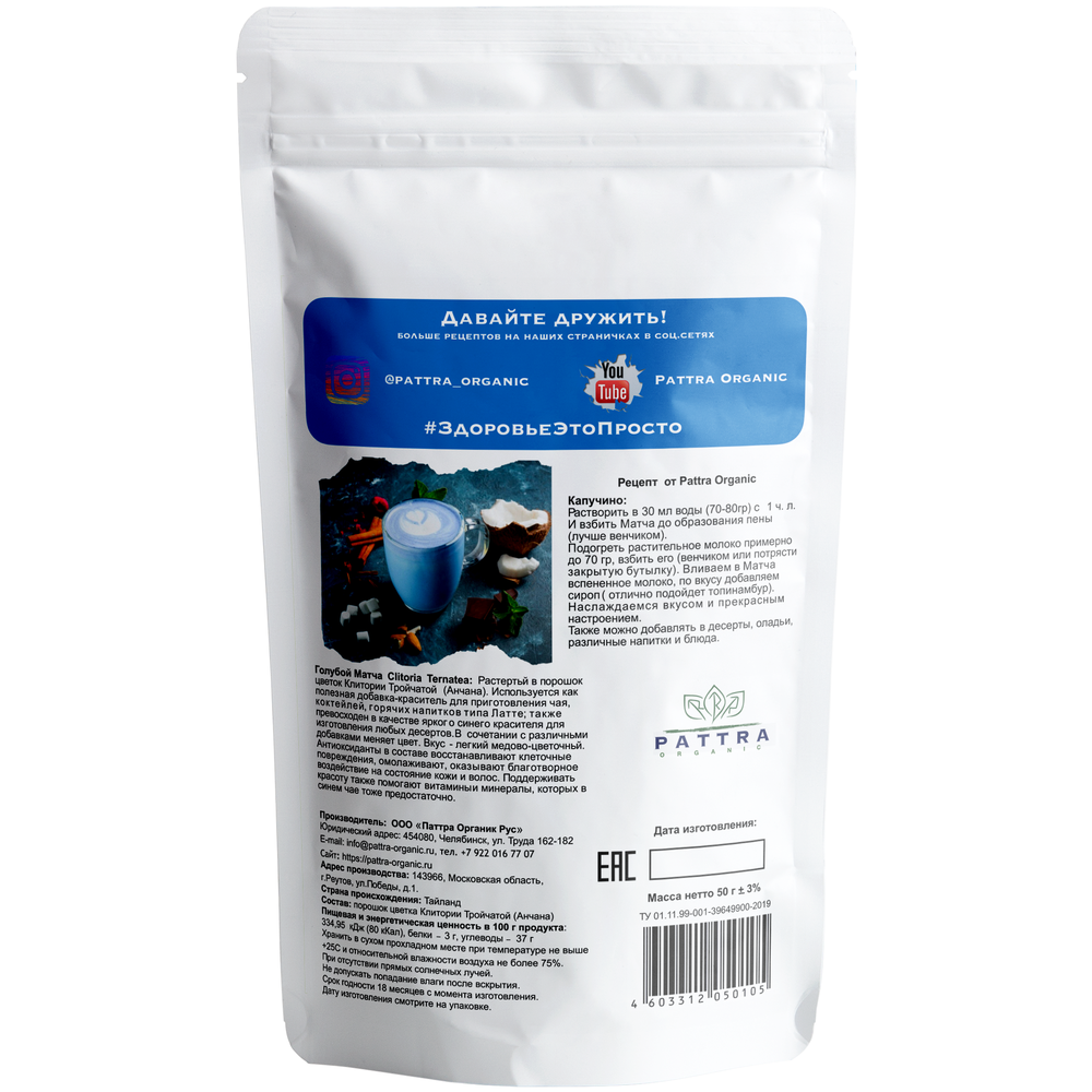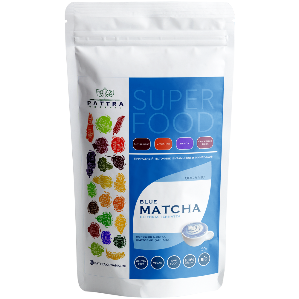 Голубой Матча Clitoria Ternatea: Растертый в порошок цветок Клитории Тройчатой (Анчана). Используется как полезная добавка-краситель для приготовления чая, коктейлей, горячих напитков типа Латте; также превосходен в качестве яркого синего красителя для изготовления любых десертов. В сочетании с различными добавками меняет цвет. Вкус - легкий медово-цветочный. Антиоксиданты в составе восстанавливают клеточные повреждения, омолаживают, оказывают благотворное воздействие на состояние кожи и волос. Поддерживать красоту также помогают витамины и минералы, которых в синем чае тоже предостаточно.