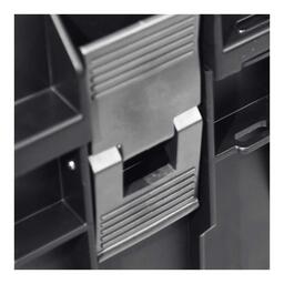 Преимущества: - оснащен специальными замками и уплотнителями для влаго и пыле защиты; - максимальный упор на крышку 120 кг; - застежки, сделанные из технического полиамида; - ящик изготовлен из поликарбоната; - внутри две подвижные перегородки; - в комплекте емкости с возможностью подвески на стену: 4 шт, небольших + 2 шт, большие; - две ручки для переноски в вертикальном и горизонтальном положении; - конструкция усилена дополнительными внутренними и внешним ребрами; - ящики можно свободно комбинировать друг с другом, для модульной сборки.