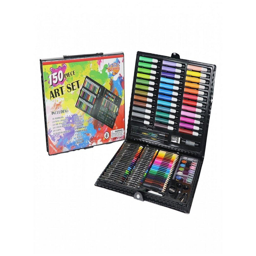 Набор для детского художественного творчества в подарочной упаковке состоит из 150 предметов. В нем находятся все нужные для детского творчества предметы, набором могут пользоваться дети в любом возрасте. Каждый предмет сложен в свою ячейку, а это значит, что все будет под рукой и никогда не потеряется. В сложенном виде кейс напоминает чемоданчик, который легко можно использовать как дома, так и в дороге. Кейс раскладывается просто, как книга. Компактный чемоданчик превращается в полноценное удобное рабочее место юного художника. Такой набор станет отличным подарком для детей в школу или на любой праздник! В набор входят фломастеры 36 шт, масляные карандаши 24 шт, грифельные мелки 24 шт, цветные карандаши 24 шт, акварельные краски 12 шт, палитра для красок, скрепки 20 шт, простой карандаш, кисточка, ластик, клей, ножницы, степлер, точилка, линейка, скрепки.