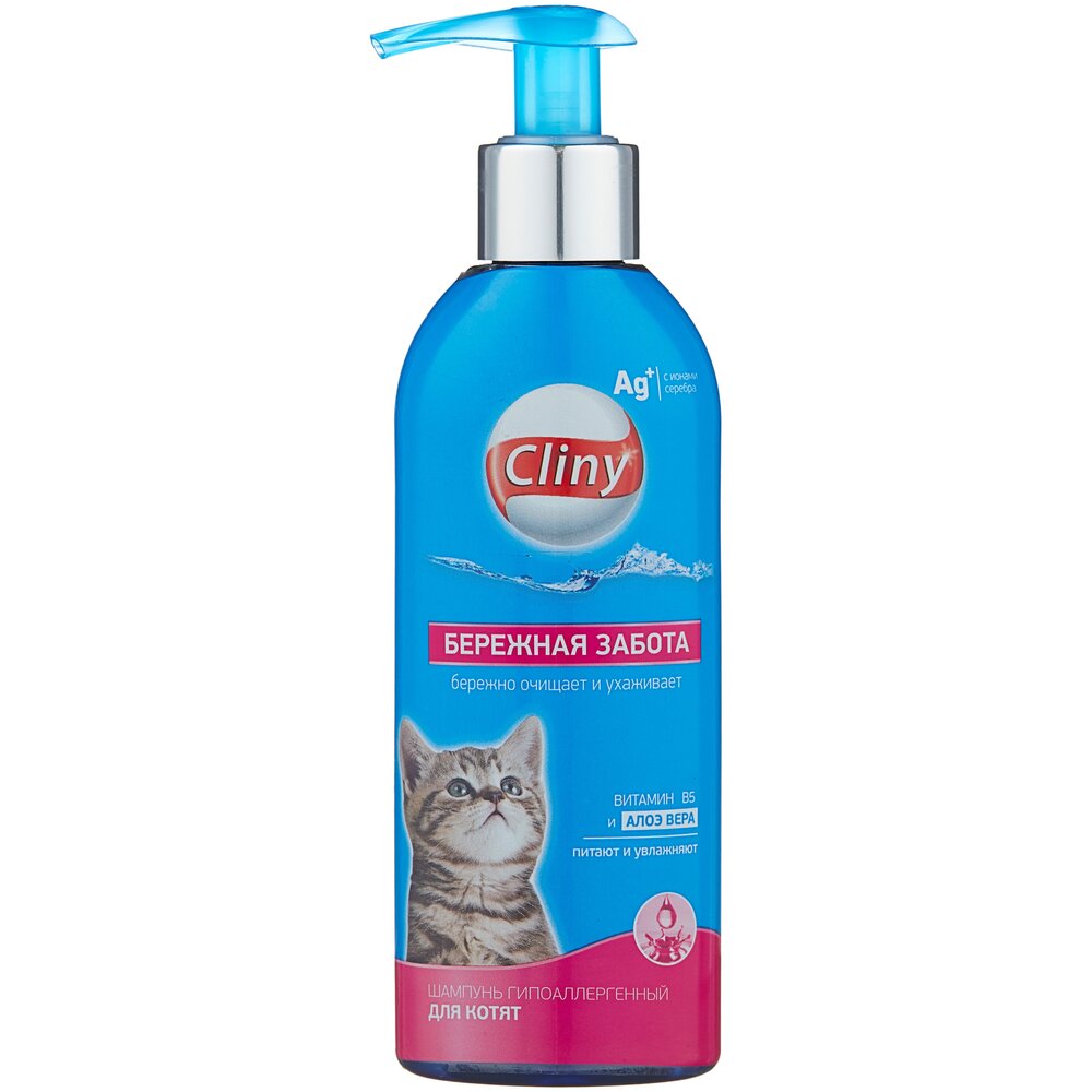 Шампунь Cliny Бережная забота разработан для котят. Специальная формула бережно очищает нежную кожу и шерсть, не вызывая раздражения. Богатые витамином Е и провитамином В5 экстракты алоэ вера и пророщенной пшеницы питают и увлажняют, активизируют рост шести, поддерживают естественный баланс кожи. Ионы серебра оказывают антибактериальный эффект, защищая от воздействия патогенных бактерий.<p>Способ применения: шампунь не требует разведения — он сразу готов к использованию. Хорошо смочите кожу и шерсть животного, нанесите шампунь, помассируйте до образования пены и тщательно смойте. Просушите и расчешите шерсть.</p>
