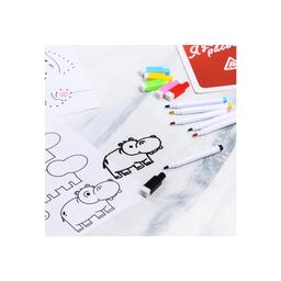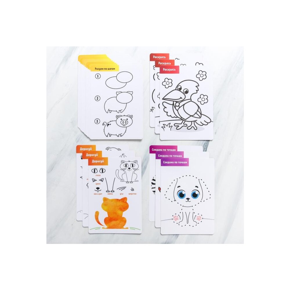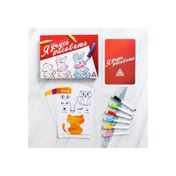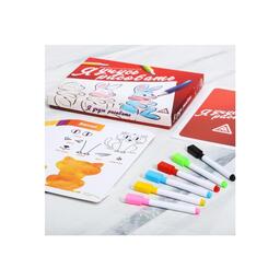 Я учусь рисовать Перед вами увлекательные карточки-раскраски, с которыми можно играть где угодно: в дороге, в детском саду, в гостях или просто дома. Вас ждут двухсторонние карточки с заданиями. Надо будет и дорисовывать, и раскрашивать, и соединять точки. Какие задания есть в игре? Дорисуй (ламинированные карты). На каждой карточке есть цветной силуэт животного или предмета. Нужно дорисовать его так, чтобы он стал похож на образец в правом верхнем углу. Раскрась (ламинированные карты). В заданиях этого типа участникам предстоит просто аккуратно раскрасить картинку цветными маркерами! Соедини по точкам (ламинированные карты). Нужно дорисовать картинку, правильно соединив точки. После этого её можно раскрасить! Рисуем по шагам (неламинированные карты). В заданиях этого типа карточки не ламинированные, то есть на них нельзя рисовать. Для них понадобится пустая ламинированная карта (на ней-то и нужно рисовать). На каждой карточке есть схема, как пошагово нарисовать то или иное животное или предмет. Внутри вы найдёте 19 двухсторонних карт. 1 пустую ламинированную карту. 6 цветных маркеров. Правила игры. Увлекательная и творческая игра для детей!