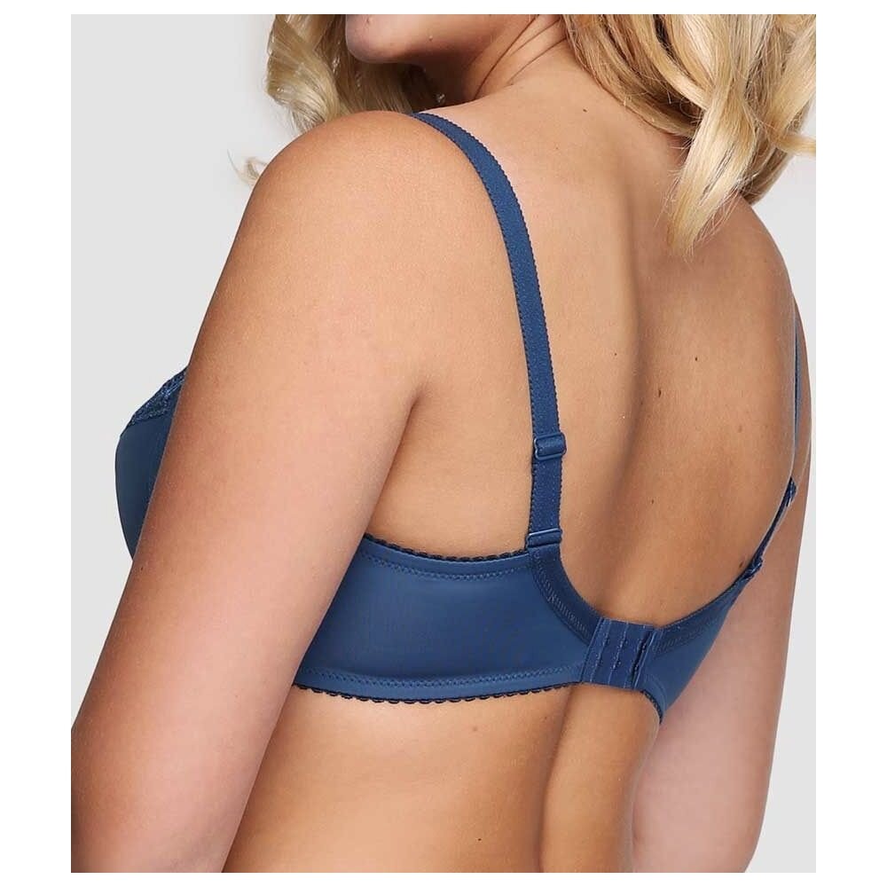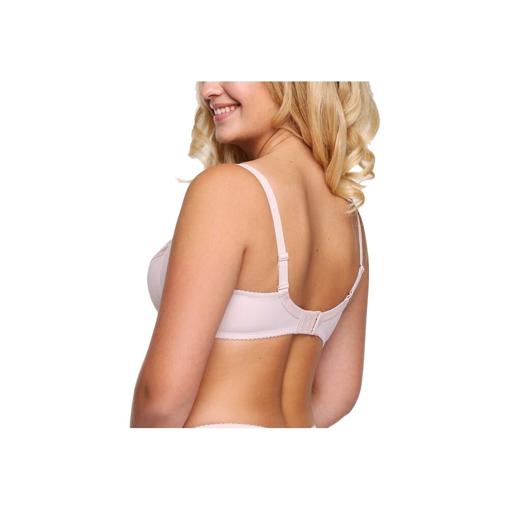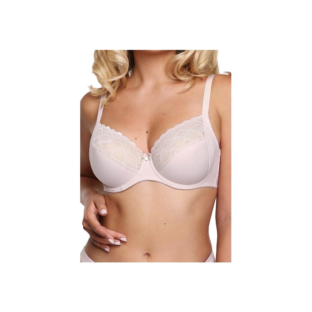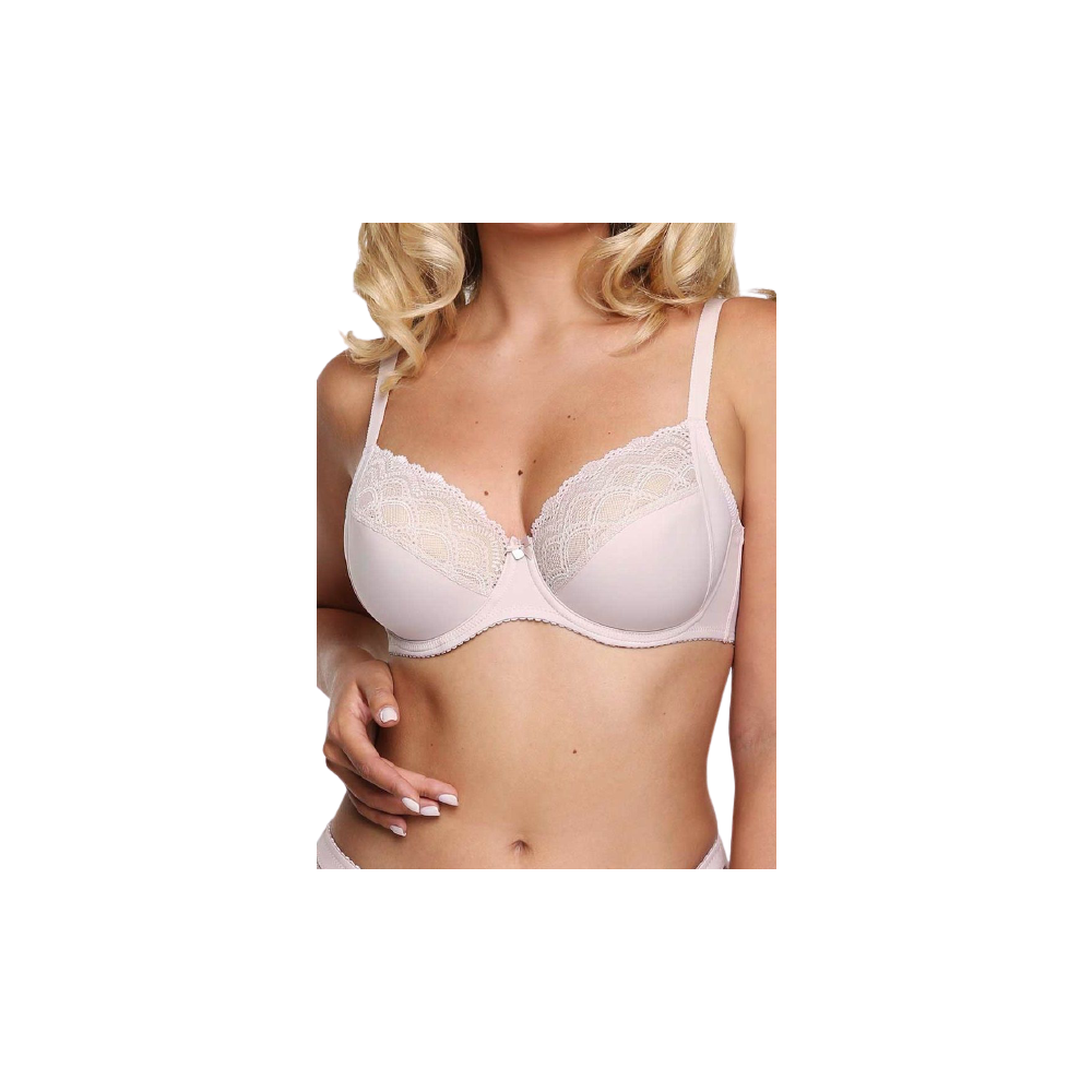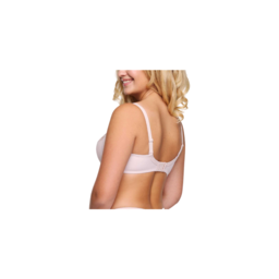 Лёгкий бюстгальтер с мягкой чашкой на каркасах. Конструкция чашечки трехсекционная, верхняя деталь из функционального эластичного кружева. Край кружева фиксирует прозрачная силиконовая лента. Нижняя деталь и боковой подкрой из стабильного эластичного полотна на дублире (тонкая эластичная сетка). Серединка бюстгальтера и боковая панель из эластичного полотна на дублире (монокапрон). Задняя панель выполнена из эластичного полотна с U-образным вырезом.