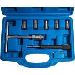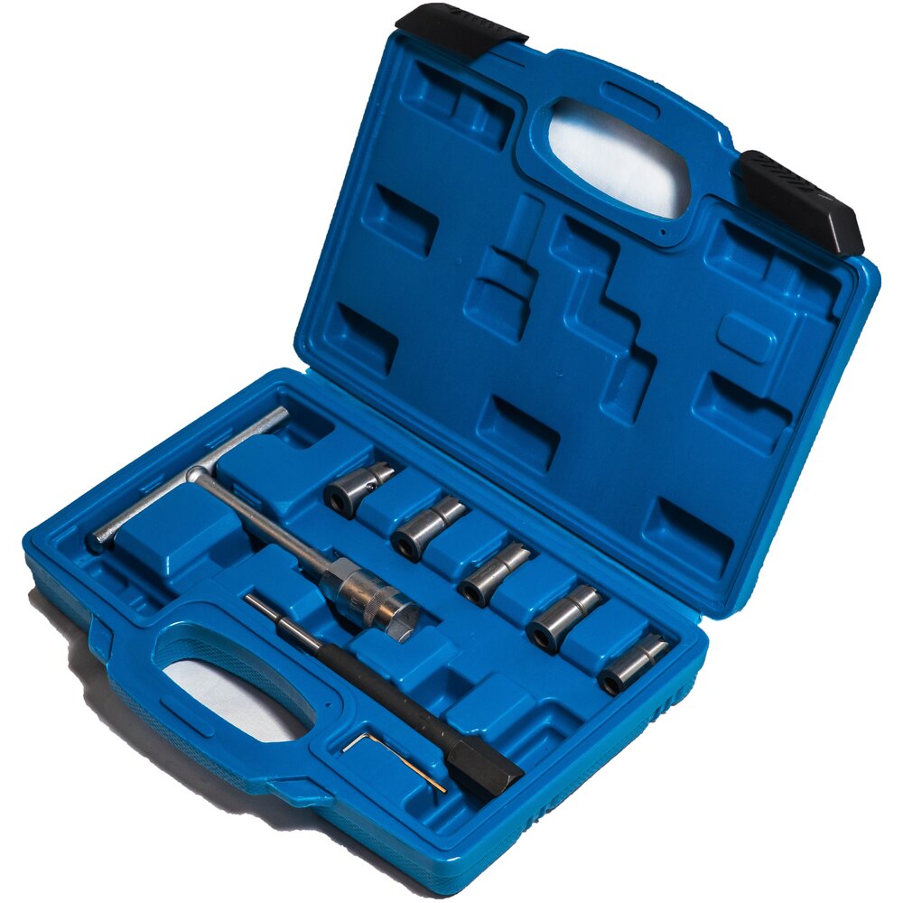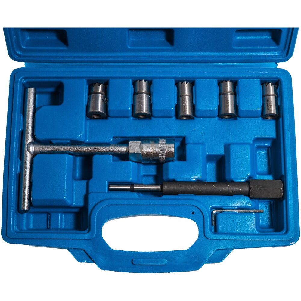 Набор фрез предназначен для чистки посадочных мест топливных форсунок дизельных двигателей Состав набора: 1)15x19 мм универсальная плоская фреза 2)17х17 мм плоская фреза для форсунок Delphi/Bosch (BMW/PSA/Renault/Ford) 3)17x17 мм угловая фреза для форсунок Mersedes CDI; 4)17x19 мм плоская фреза для форсунок Bosch (Mercedes CRD) 5)17x21 мм угловая развёртка для форсунок Fiat/Iveco 6)Т-образный держатель 7)Направляющая 8)Ключ шестигранный
