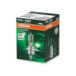 Современная галогенная автолампа известного немецкого бренда Osram серии All Season Super с увеличенной яркостью позволяет водителям даже в условиях недостаточной видимости реагировать на опасности на дороге гораздо быстрее. По сравнению со стандартными аналогами, этот всепогодный источник света имеет специальное интерференционное желтое покрытие колбы, что обеспечивает на 30% больше света на дороге в самых тяжелых погодных условиях. Эта лампа относится к типу Н4 с цоколем Р43t и предназначена для фар ближнего и дальнего света легковых автомобилей с бортовым напряжением 12 Вольт. Потребляемая мощность устройства равна 55 и 60 Ватт для разных режимов работы. Оно излучает желтый свет с цветовой температурой 3000 Кельвинов. Световой поток достигает до 1000 и 1650 Люменов для каждой нити накаливания соответственно.