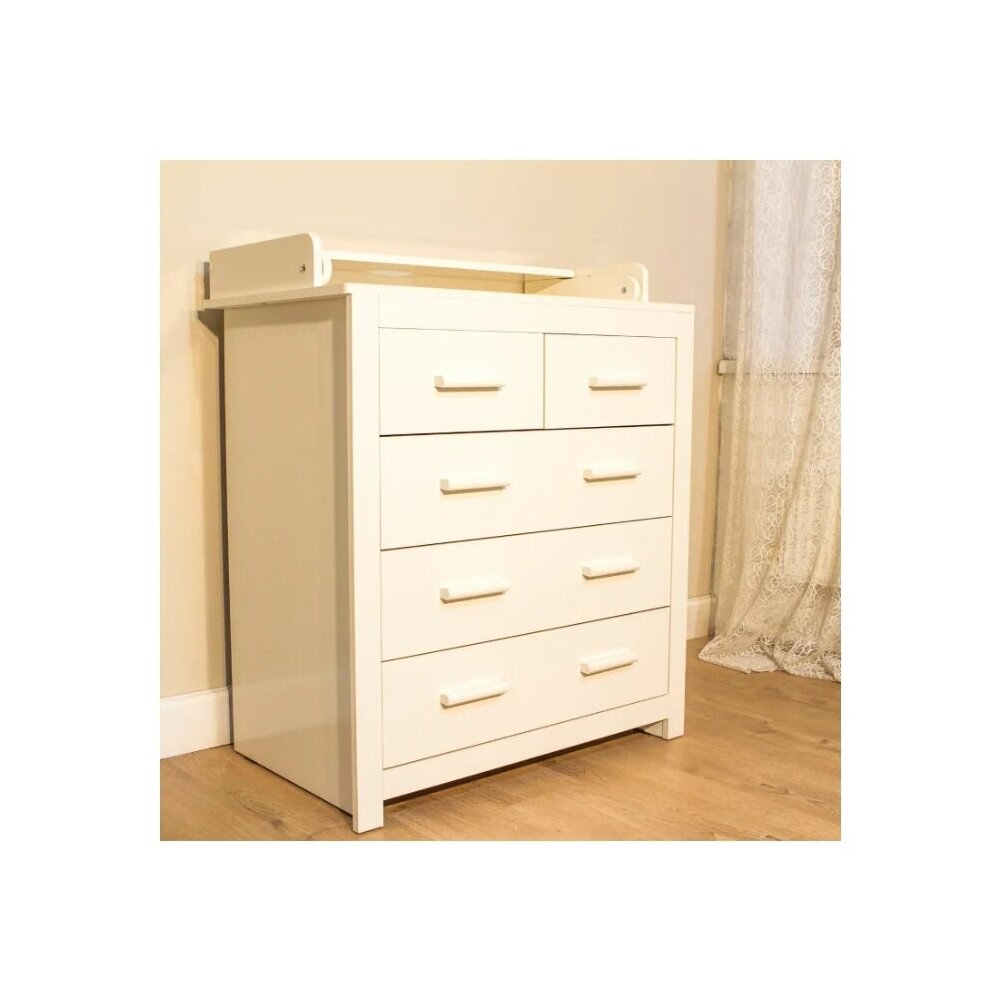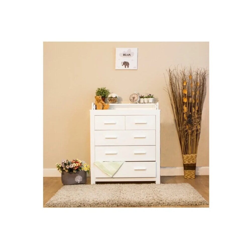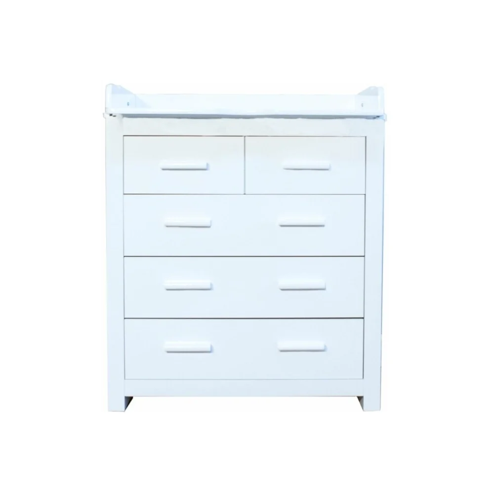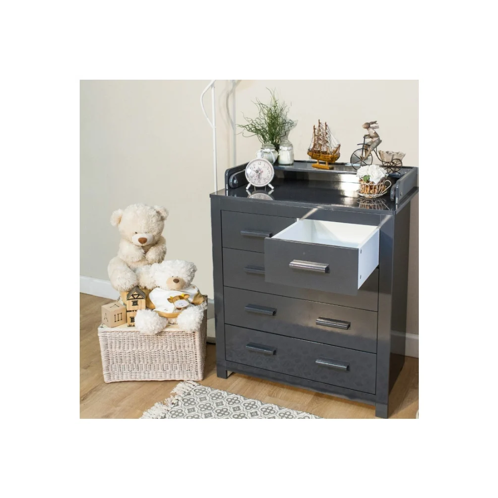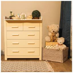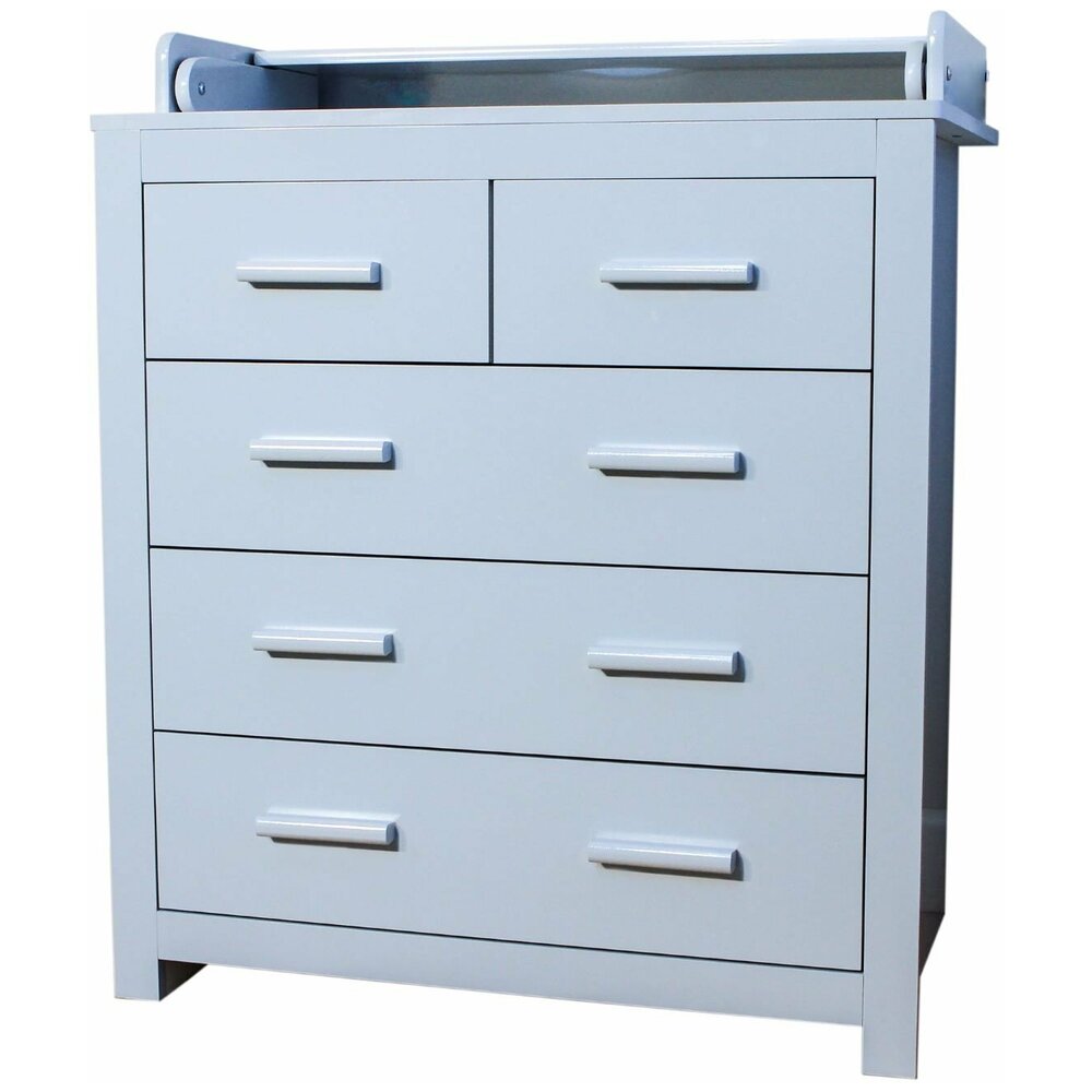 Практичный и невероятно удобный комод поможет вам в уходе за ребенком. Широкий комод оснащен откидной полкой, что обеспечивает безопасное пеленание малыша. В комплекте имеется мягкий настил на пеленальный столик. В дальнейшем откидную полку можно убрать.Размер пеленального столика (ШхД): 75х67 см.Нагрузка на пеленальный столик: 10 кг.В глубоких ящиках на шариковых направляющих немецкого производства Hettich, обеспечивающих бесшумное закрывание, поместятся все вещи ребенка. Комод сочетает в себе превосходное качество и современный дизайн.Материалы: МДФ, ЛДСП. Ручки ящика из натуральной древесины 140х20х25 мм.