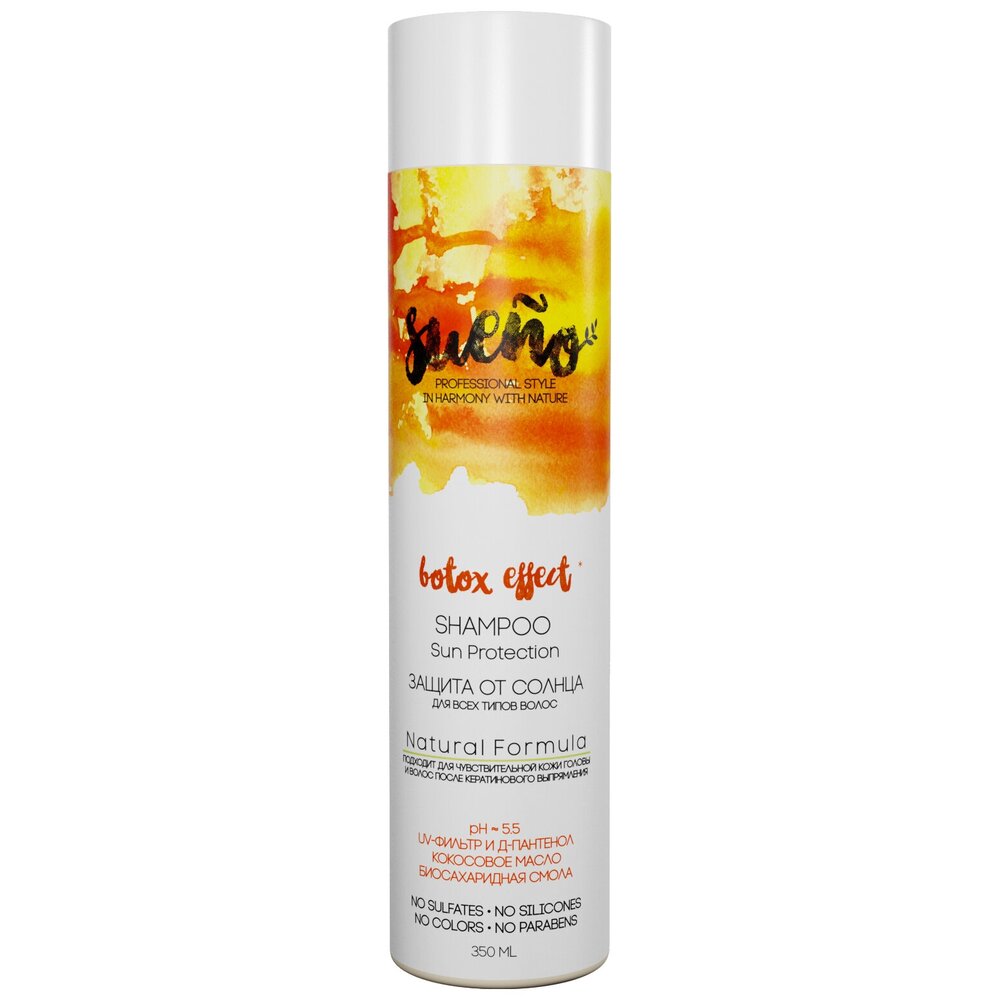 Профессиональный шампунь без сульфатов SUENO защита от солнца имеет натуральный состав. Подходит для ежедневного применения, в том числе и зимой. Кватерниум-95, УФ-фильтр, поглощает и отражает УФ-А и УФ-В излучения; биосахаридная смола выстраивает мономолекулярный слой, защищающий кожу головы и локоны от обезвоживания и воздействия УФ-лучей, предотвращает выгорание цвета волос, является термозащитой, придает сияние и блеск, восстанавливает структуру волос; провитамин B5 усиливает защитные свойства от воздействия УФ-излучения, высоких и низких температур, морской воды и ветра, заполняет собой все повреждения, снижает потерю влаги, питает волосы; молочная кислота очищает волосы и вымывает соль, укрепляет, придает шелковистость, здоровый блеск, сияние волосам; кокосовое масло, благодаря насыщенным жирным кислотам и витаминам А и B, удерживает влагу в стержне волоса, не дает вымываться кератину, предотвращает сечение и ломкость, служит термозащитой.