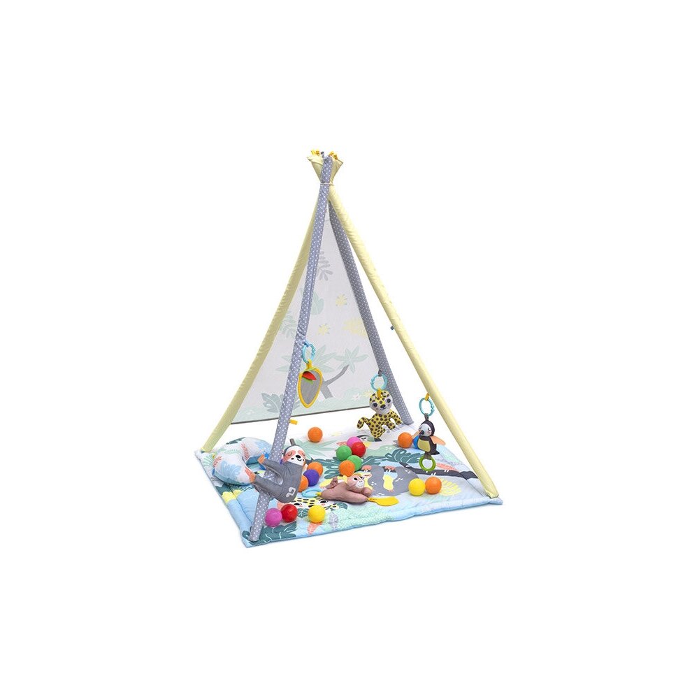 Развивающий коврик с игрушками Finkids «Shelter Activity Gym» в форме тента.<br />Доступные функции и комплект поставки:<p>Съемный тент позволит создать малышу уют и спокойную обстановку;</p><p>4 дуги для установки тента;</p><p>3 мягких подвесных игрушки и еще 1 игрушка с музыкальным блоком внутри;</p><p>Безопасное игрушечное зеркало с защитной пленкой;</p><p>20 разноцветных пластмассовых безопасных шариков;</p><p>Для удобства малыша в комплект поставки входит мягкая подушечка.</p><p>Размеры изделия в собранном виде: Высота тента: 110 см;<br />Основание коврика: 82×82 см.<br />Материалы: полиэстер, пластик.<br />ВНИМАНИЕ! При использовании зеркальца необходимо удалить защитную пленку!<br />Дополнительная информация:<br />Развивающий детский коврик Funkids «Shelter Activity Gym» — создаст уютное пространство для игр вашего малыша, которое поможет ему развиваться и познавать мир. Ковриком вы можете пользоваться с момента рождения до полутора лет.<br />Мягкий развивающий коврик станет для ребенка превосходным развлечением и поможет ему быстрее осваивать различные умения и навыки. Сочетание ткани различной фактуры у коврика и игрушек тренирует сенсомоторику, а яркие цвета и забавные орнаменты радуют глаз.<br />Дополнительная подушечка позволит удобно расположиться как на спинке, так и на животике. Игрушка изготовлена из высококачественных, абсолютно безопасных, гипоаллергенных материалов.<br />Уход: мягкие части коврика можно стирать в машине и сушить на воздухе, пластиковые части — протирать влажной тканью.<br />Рисунки на ковриках и формы игрушек могут незначительно отличаться от представленных на фотографиях.<br />Для использования с рождения до 1,5 лет (категория 0+).</p>