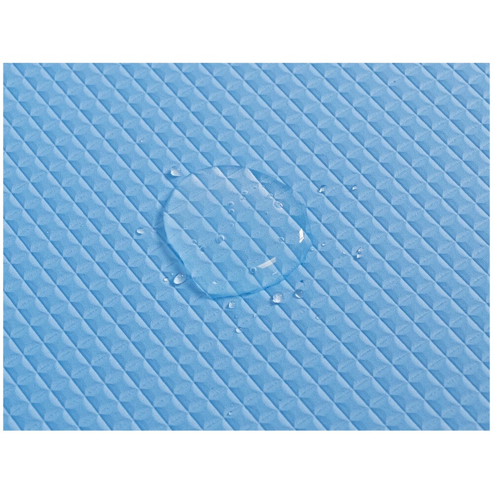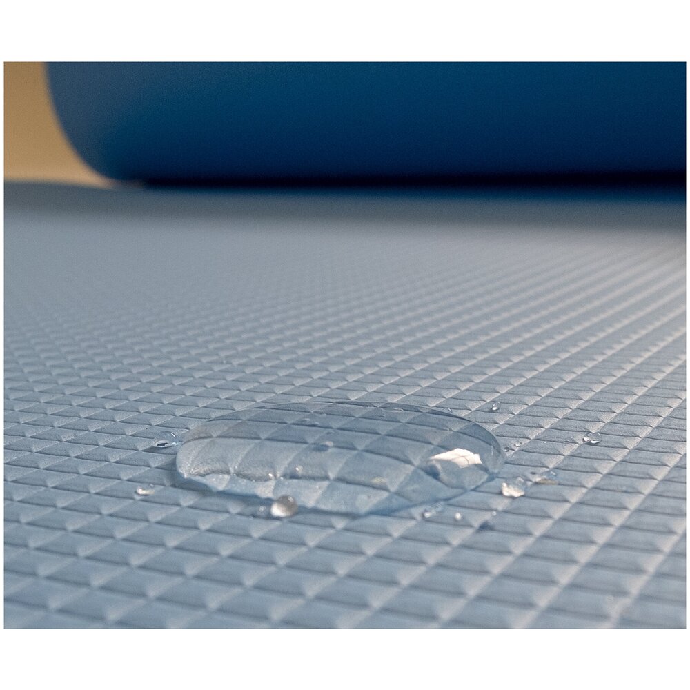 Плотный коврик толщиной 6 мм, сделан из экологически безопасного материала, который можно полностью переработать. Важным достоинством материала является его водостойкость, он не впитывает влагу, за счет его плотности. При этом коврик легкий, имеет хорошее сцепление с полом и обладает хорошими амортизационными качествами. К коврику прилагается удобный ремешок на липучках с ручками для ношения.