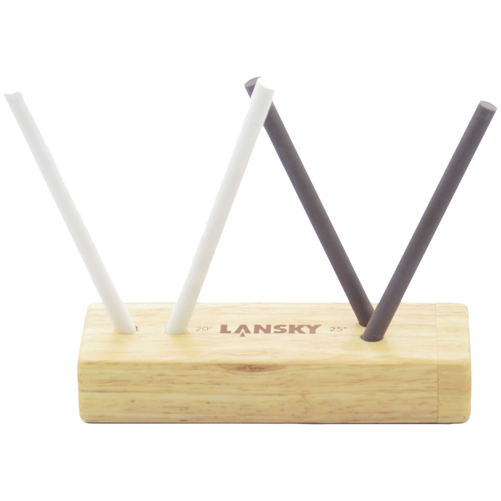 Набор состоит из подставки и 4-х керамических стержней. Зернистость стержней: 1. medium (средняя) – коричневые стержни 600 грит; 2. fine (мелкая) – белые стержни 1000 грит. Подставка оборудована отверстиями под 25 и 20 градусов и изготовлена из высококачественного бамбука. Стальные стержни устанавливаются в отверстия 25 градусов, белые в 20 градусов. Правка ножа производится перемещением ножа от пятки к кончику без усилия, при этом перемещая нож по вертикали сверху вниз. Размеры: 152х51х28 мм Сечение стержней: круглое. Длина стержней: 125 мм. Размер зерна: 600, 1000 grit.
