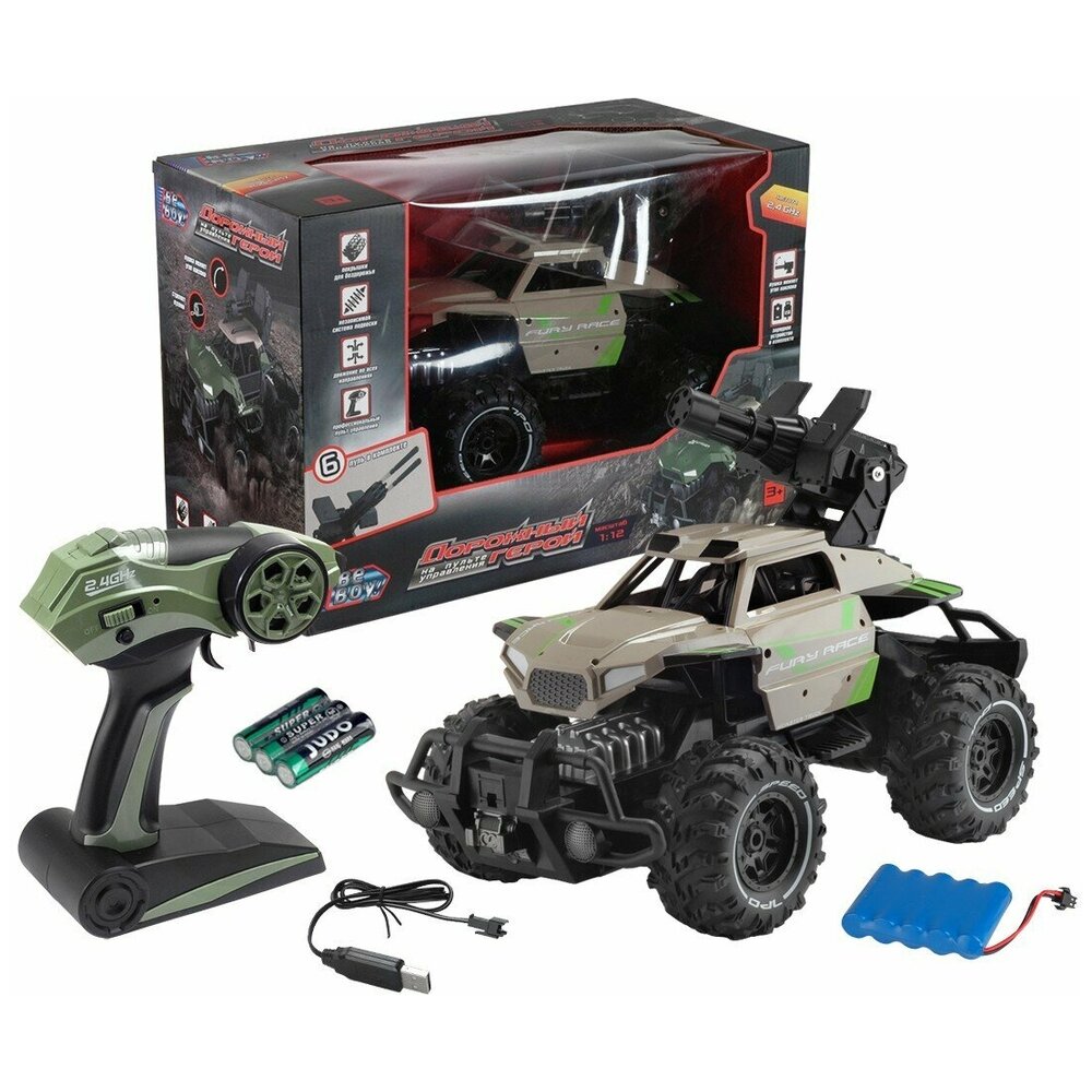 Машинка на радиоуправлении "BeBoy" в комплекте: профессиональный пульт управления (3 батарейки 1,5V АА в комплекте), аккумулятор 6V, USB зарядное устройство. Движение во всех направлениях. На машинке установлены покрышки для бездорожья. Независимая система подвески. На машинке установлена пушка с пульками: пушка стреляет патронами при нажатии кнопки на пульте управления и может менять угол наклона, в комплекте 6 пуль. Частота 2,4 GHz. М1:12. Цвет: серый. В коробке 45,1*22*30,5 см.