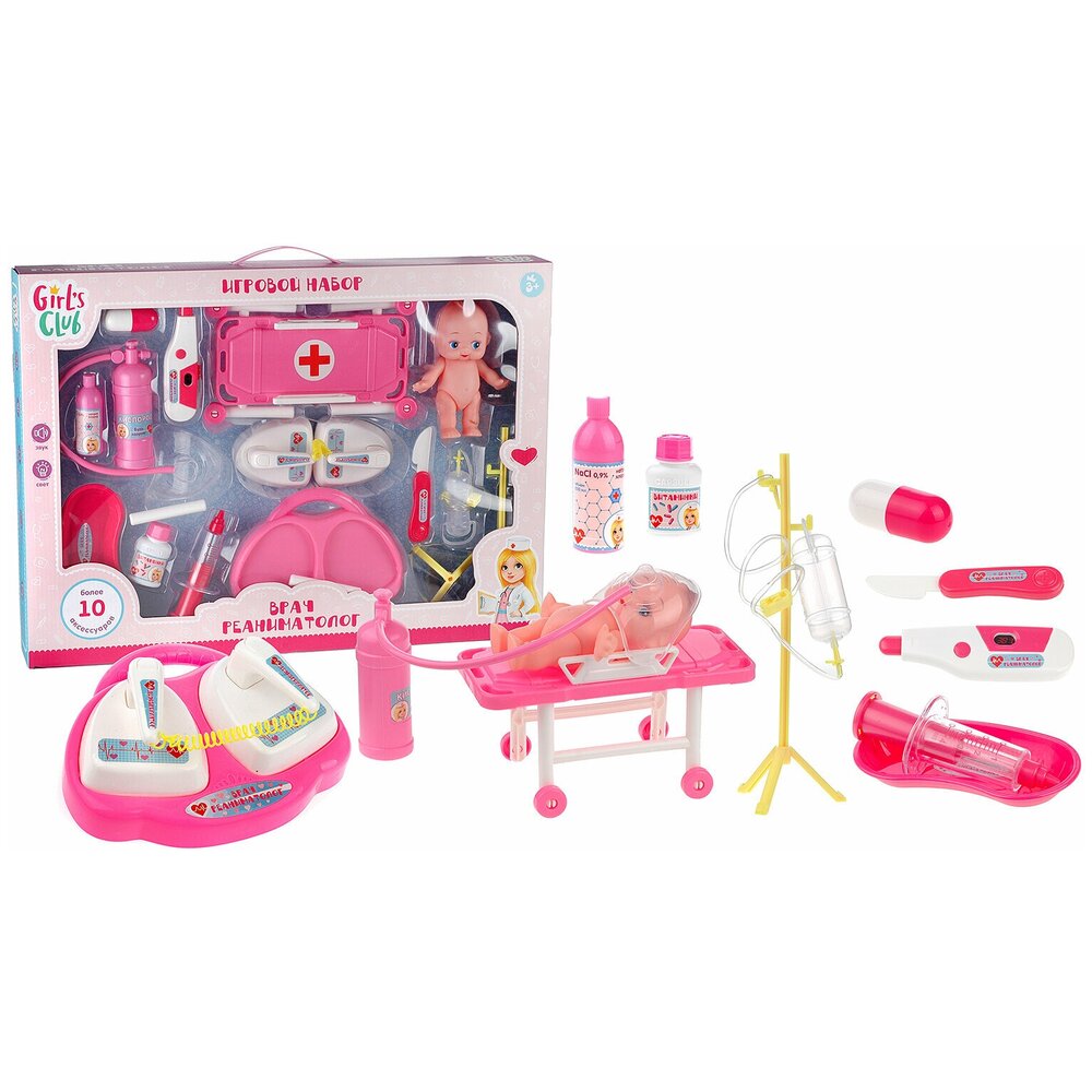 Набор "Доктор-реаниматолог"Girl's club" В комплекте: пупс, медицинские аксессуары более 10 штук. 1. Носилки раскладываются. 2. Работа прибора: первая кнопка мигает лампа - сердце (есть звук пульса. Будет просто мигание. Вторая кнопка: звук сирены, не громкий мигание поочеррёдно трёх ламп "на мониторе". Третья кнопка: мигание тех же 3-х ламп и звук - писк, изображающий работу прибора). 3. Работа термометра: подсветка шкалы при нажатии на синюю кнопку на торце градусника (предполагается прикосновение к пациенту). Подсветка шкалы. Можно изменять показания термометра, передвигая рычагом шкалу. 4. Дефибриллятор звук биения серддца. В коробке 53*39*6,7 см.